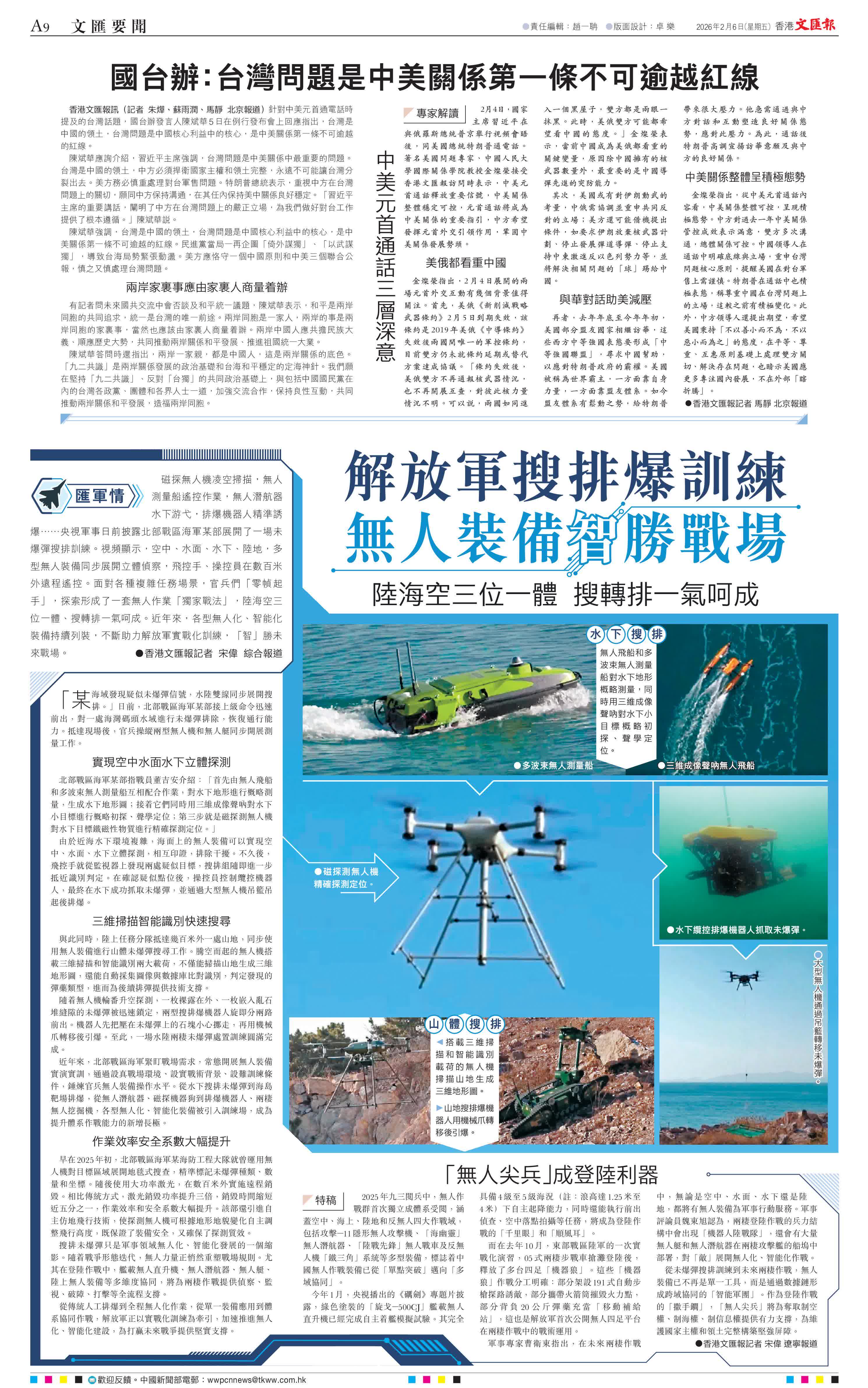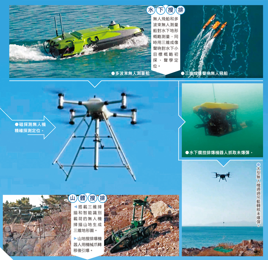 (香港文匯報記者宋偉 綜合報道)磁探無人機凌空掃描,無人測量船遙控作業,無人潛航器水下游弋,排爆機器人精準誘爆……央視軍事日前披露北部戰區海軍某部展開了一場未爆彈搜排訓練。視頻顯示,空中、水面、水下、陸地,多型無人裝備同步展開立體偵察,飛控手、操控員在數百米外遠程遙控。面對各種複雜任務場景,官兵們「零幀起手」,探索形成了一套無人作業「獨家戰法」,陸海空三位一體、搜轉排一氣呵成。近年來,各型無人化、智能化裝備持續列裝,不斷助力解放軍實戰化訓練,「智」勝未來戰場。