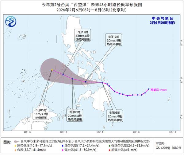 今年第2號颱風「西望洋」(熱帶風暴級)已於今天(6日)凌晨3點鐘前後在菲律賓棉蘭老島北阿古桑省沿海登陸,登陸時中心附近最大風力有9級(23米/秒),中心最低氣壓為990百帕。「西望洋」的中心早晨5點鐘位於菲律賓馬尼拉東南方向約720公里的海面上,就是北緯9.7度、東經125.3度,中心附近最大風力有8級(20米/秒),中心最低氣壓為995百帕,七級風圈半徑為180-320公里。