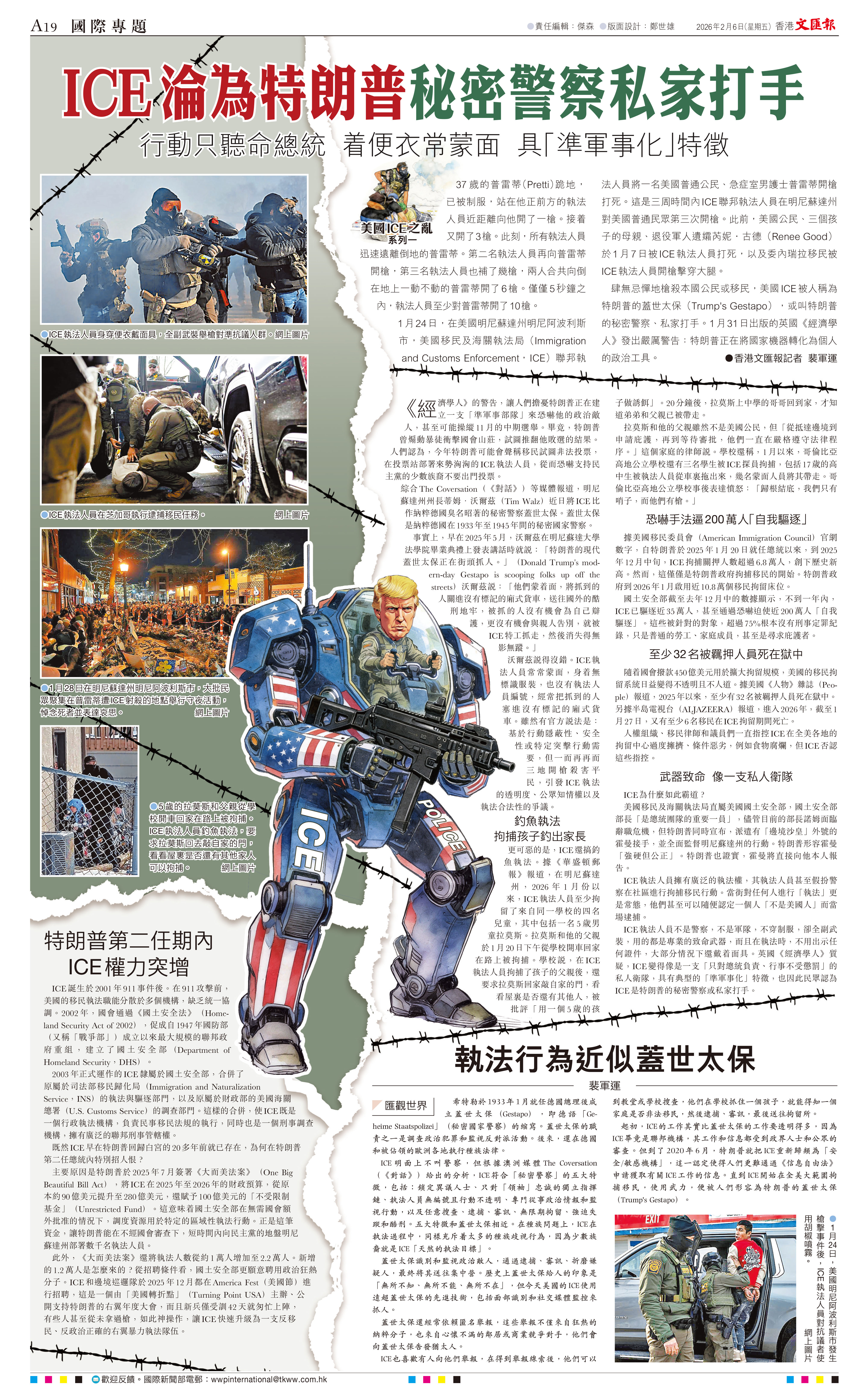 肆無忌憚地槍殺本國公民或移民,美國ICE被人稱為特朗普的蓋世太保(Trump's Gestapo),或叫特朗普的秘密警察、私家打手。1月31日出版的英國《經濟學人》發出嚴厲警告:特朗普正在將國家機器轉化為個人的政治工具。