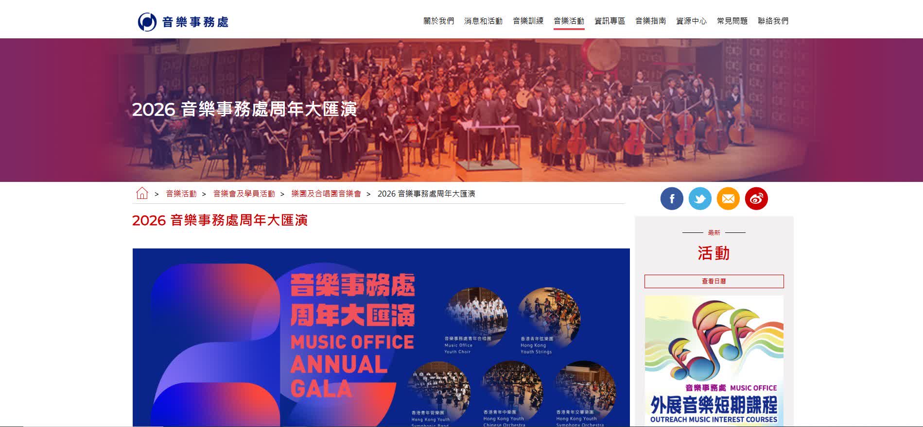 精彩節目,包括和諧優雅的合唱作品《上主的聖殿》、《橫越蒼茫、永恆之天》和《與天比高!》;弦樂傑作有韋華第《B小調第十協奏曲》和浦賽爾《G小調夏康舞曲》;管樂作品有寧謐質樸的《遮蔽的天空》和節奏飛快的哈索《馳騁》;讚頌家庭和睦和社會興旺的高胡協奏曲《紫荊花》;以及洋溢着南歐情懷的名作,分別為柴可夫斯基《意大利隨想曲》和夏布里耶《西班牙》。音樂事務處將於音樂會頒發年度獎項予最優秀學員、樂團及合唱團團員,以嘉許他們的出色表現。
