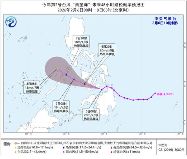 今年第2號颱風「西望洋」(熱帶風暴級)的中心今天(6日)上午8點鐘位於菲律賓馬尼拉東南方向約710公里的海面上,就是北緯9.3度、東經124.7度,中心附近最大風力有8級(20米/秒),中心最低氣壓為995百帕,七級風圈半徑為180~320公里。