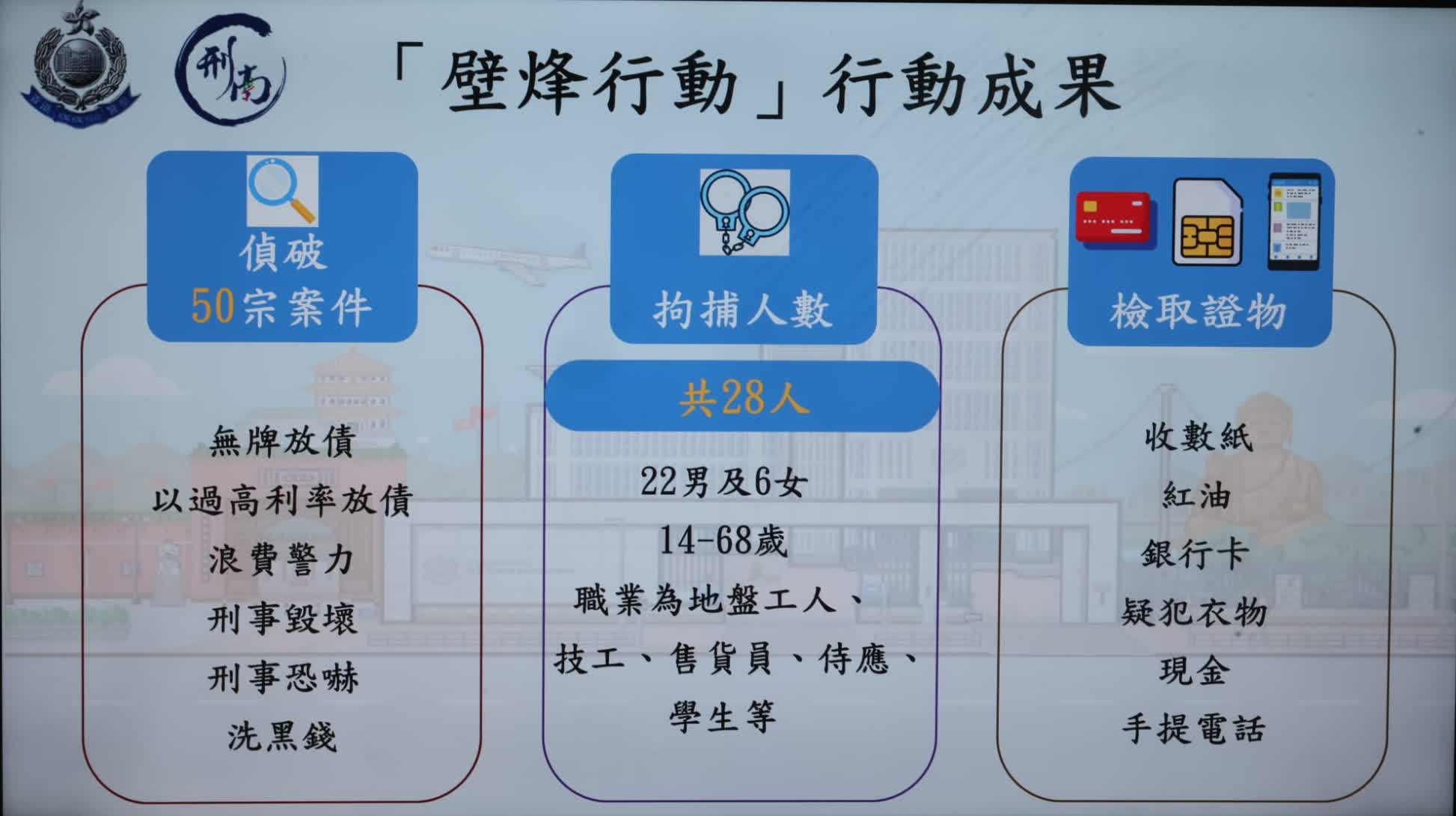香港文匯報訊(記者 蕭景源)為打擊高利貸及非法收數的犯罪活動,新界南總區刑事部聯同總區各警區,在上月26日至昨日(5日) 展開代號「壁烽」行動, 拘捕22男6女共28人,被捕人報稱地盤工人、技工、售貨員、侍應、學生等。行動共偵破50宗刑事案件, 包括「 無牌放債」、「以過高利率放債」、「浪費警力」、「刑事毀壞」、「刑事恐嚇」及 「洗黑錢」,並檢獲包括收數紙、銀行卡、現金及手提電話等證物。被捕人中涉及3名未成年人士, 年齡最細僅14歲,他們均被不法份子以金錢利誘,被招攬參與淋紅油的非法收數活動。