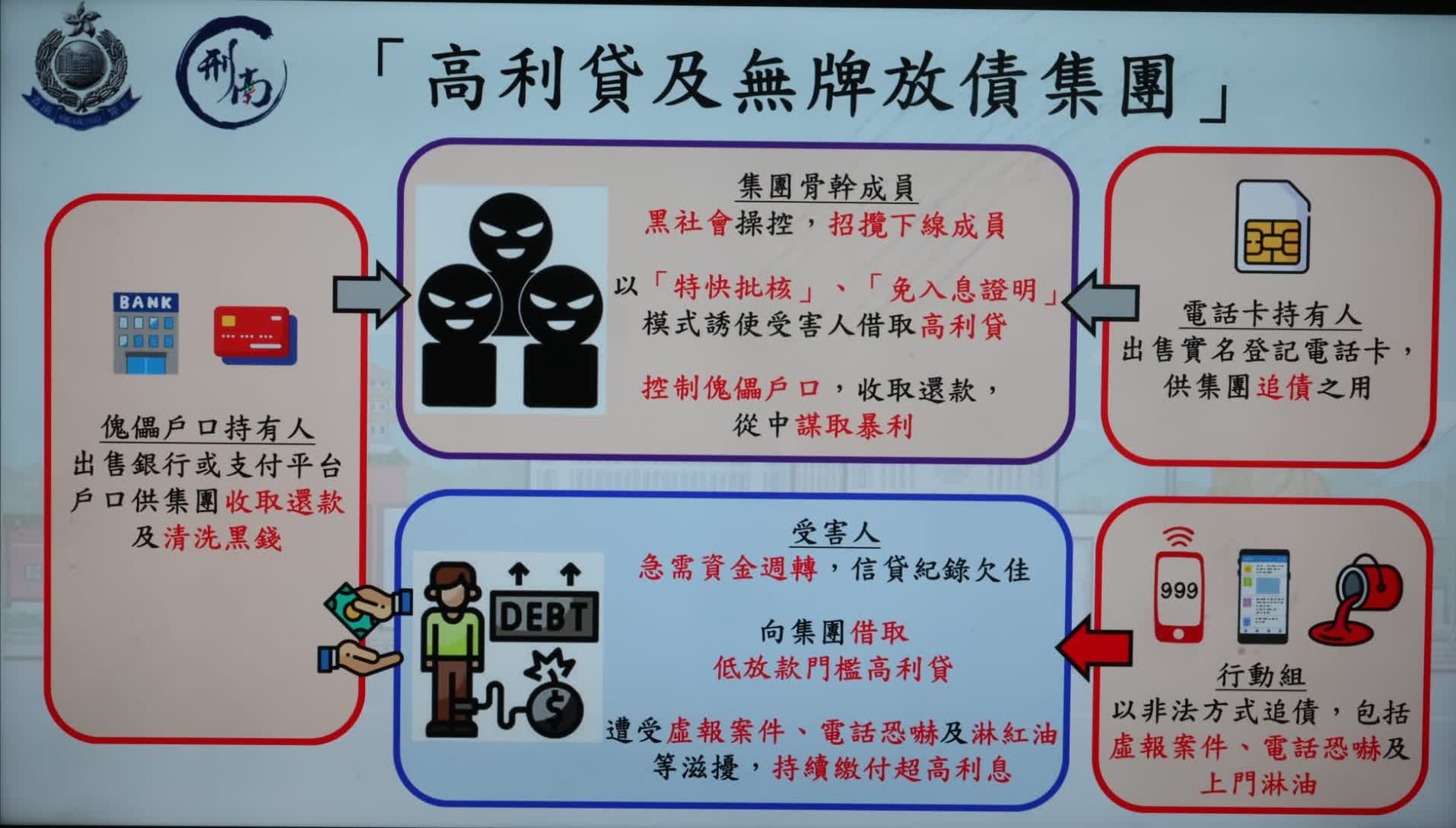 其中, 警方搗破一個由黑社會操縱的高利貸及無牌放債集團。在去年11月下旬,警方分別接獲兩宗「企圖自殺」及一宗「暴力罪行」報案,該3宗案件報稱的案發地點,均為同一個位於新界南總區的住宅單位,警員到場後, 發現單位內並無上述案件發生, 而報案人亦失去聯絡。人員經調查後, 發現該單位住戶無法償還高利貸, 住戶曾經接獲恐嚇收數電話及訊息,而單位亦曾經被淋紅油。