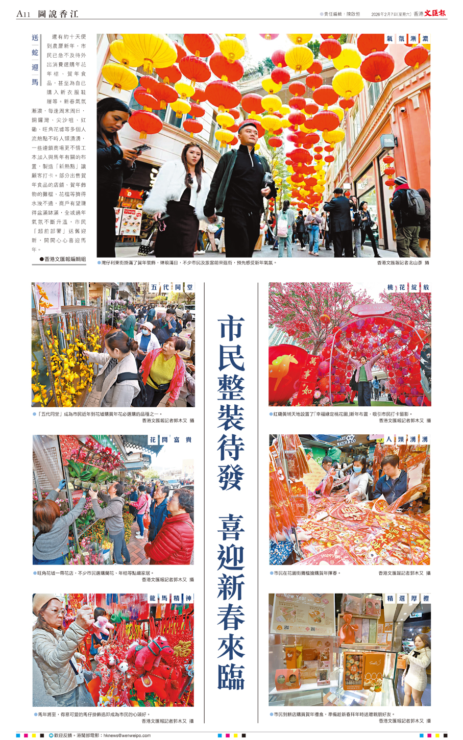 還有約十天便到農曆新年,市民已急不及待外出消費選購年花年桔、賀年食品,甚至為自已購入新衣服鞋履等。新春氣氛漸濃,每逢周末周日,銅鑼灣、尖沙咀、紅磡、旺角花墟等多個人流熱點不時人頭湧湧,一些連鎖商場更不惜工本加入與馬年有關的布置,製造「新熱點」讓顧客打卡。部分出售賀年食品的店舖、賀年飾物的攤檔、花檔等擠得水洩不通,商戶有望賺得盆滿缽滿,全城過年氣氛不斷升溫,市民「超前部署」送舊迎新,開開心心喜迎馬年。