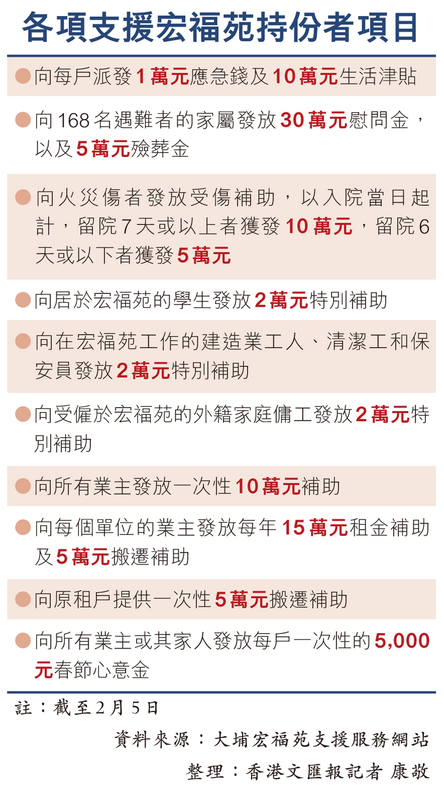 特區政府並迅速成立「大埔宏福苑援助基金」,並投入3億元作為啟動資金。截至上月26日,援助基金總額已達45億元。至今,援助基金已提供了多項援助,特區政府各部門亦陸續推出多項經濟援助,以及為宏福苑的居民提供各項醫療援助。政府亦與資訊科技業界構建物資捐獻網上平台,讓團體及市民登記可捐贈的物資,在有需要時分發物資予居民。