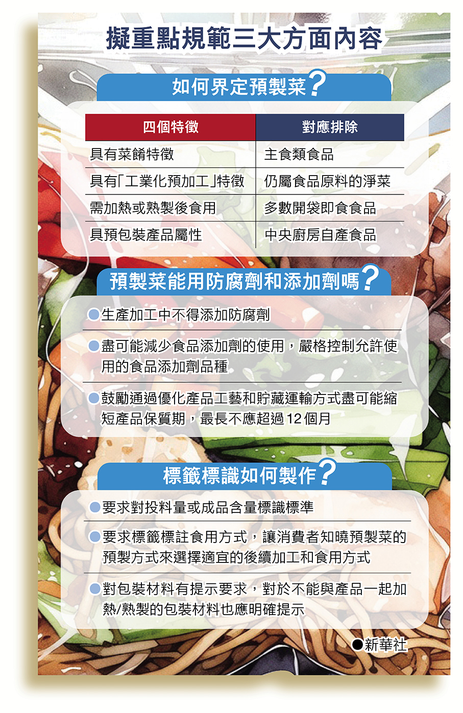 徵求意見稿重點從食品安全和營養健康方面對預製菜作出規定。明確預製菜是以一種或多種食用農產品及其製品為原料,使用或不使用調味料等輔料,不添加防腐劑,經工業化預加工(如攪拌、醃製、滾揉、成型、炒、炸、烤、煮、蒸等)製成,配以或不配以調味料包,加熱或熟製後方可食用的預包裝菜餚產品。預製菜不包括主食類食品、淨菜類食品、即食食品和中央廚房製作的菜餚。預製菜的產品保質期,最長不應超過12個月。