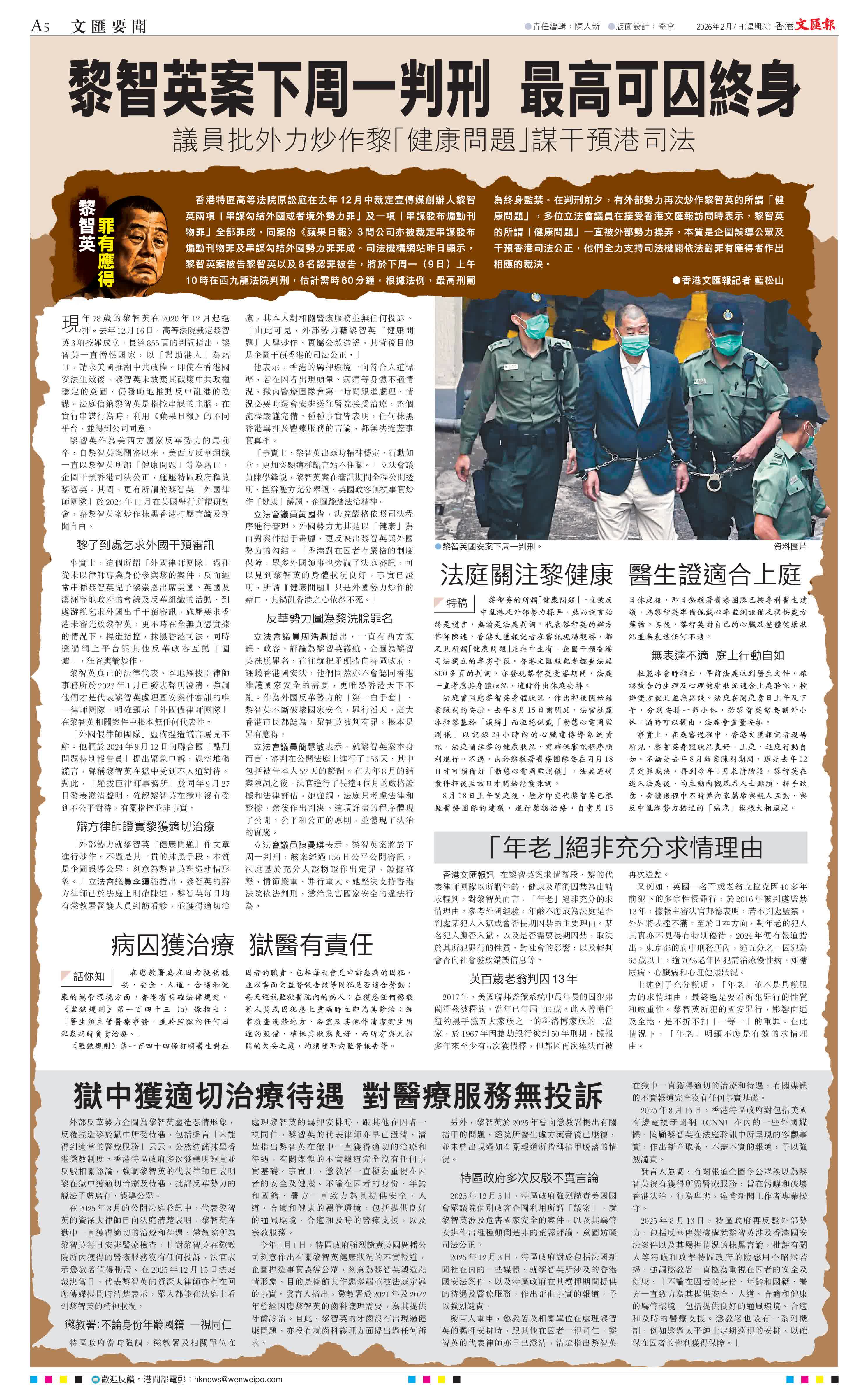 (香港文匯報記者 藍松山)香港特區高等法院原訟庭在去年12月中裁定壹傳媒創辦人黎智英兩項「串謀勾結外國或者境外勢力罪」及一項「串謀發布煽動刊物罪」全部罪成。同案的《蘋果日報》3間公司亦被裁定串謀發布煽動刊物罪及串謀勾結外國勢力罪罪成。司法機構網站昨日顯示,黎智英案被告黎智英以及8名認罪被告,將於下周一(9日)上午10時在西九龍法院判刑,估計需時60分鐘。根據法例,最高刑罰為終身監禁。在判刑前夕,有外部勢力再次炒作黎智英的所謂「健康問題」,多位立法會議員在接受香港文匯報訪問時表示,黎智英的所謂「健康問題」一直被外部勢力操弄,本質是企圖誤導公眾及干預香港司法公正,他們全力支持司法機關依法對罪有應得者作出相應的裁決。