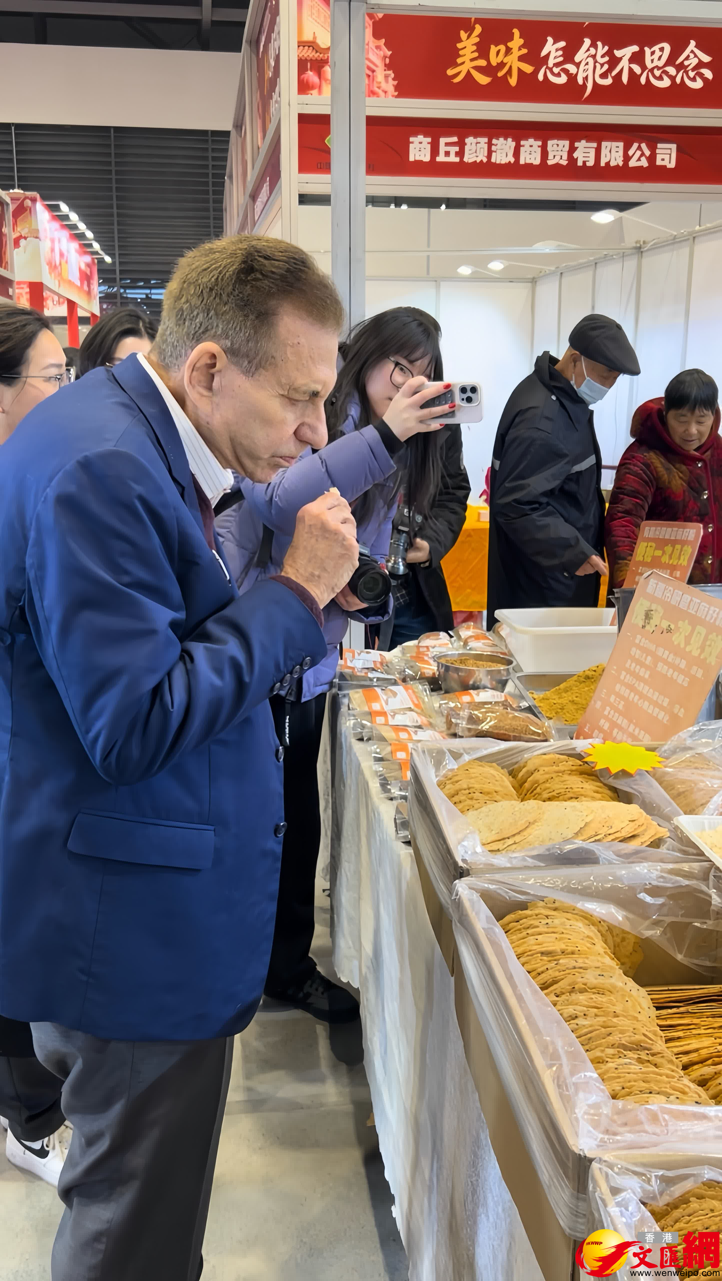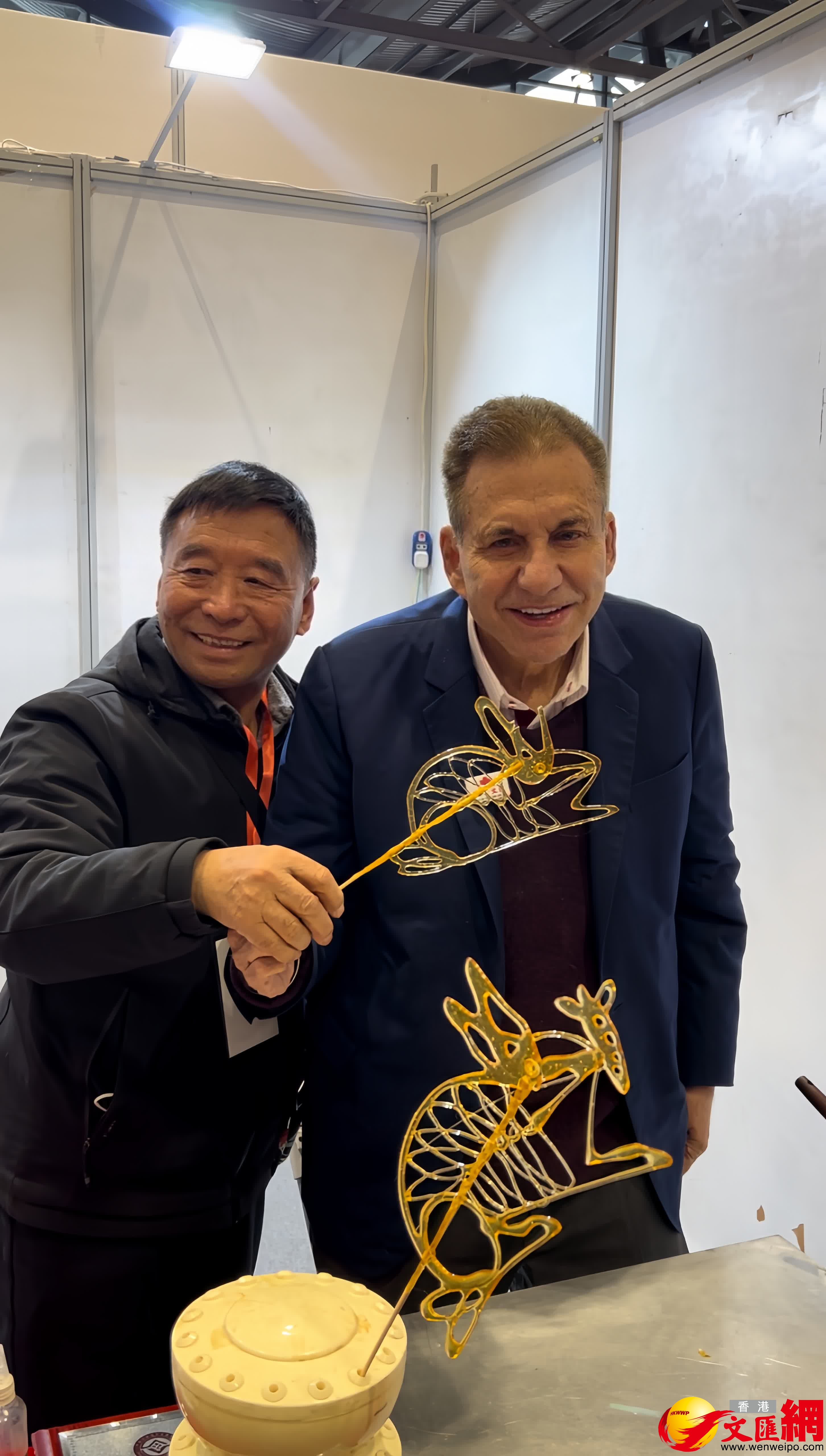 卡薩達教授的年貨節之旅格外豐富,除了被展會上琳琅滿目的展品吸引,他還饒有興緻地體驗了非遺畫糖畫,在非遺傳承人劉三的指導下勾勒出「一隻糖兔」,感受傳統民俗的獨特魅力。劉三笑着說:「咱們的年貨節非常熱鬧,中外客商和遊客都來逛,不僅有本地特色,還有全球好物,特別有氛圍。」卡薩達教授也感慨,這場年貨節不僅有河南特色的美食、手工藝品、美酒,更匯聚了世界各地的精品,「我甚至看到了一輛手工邁巴赫汽車,這款車在美國售價高達340萬美元。從百姓日常的基礎食品,到世界頂級的豪華汽車,都齊聚這裏向中原人民乃至全國各地的市民展示,這樣的展會太有魅力了。」