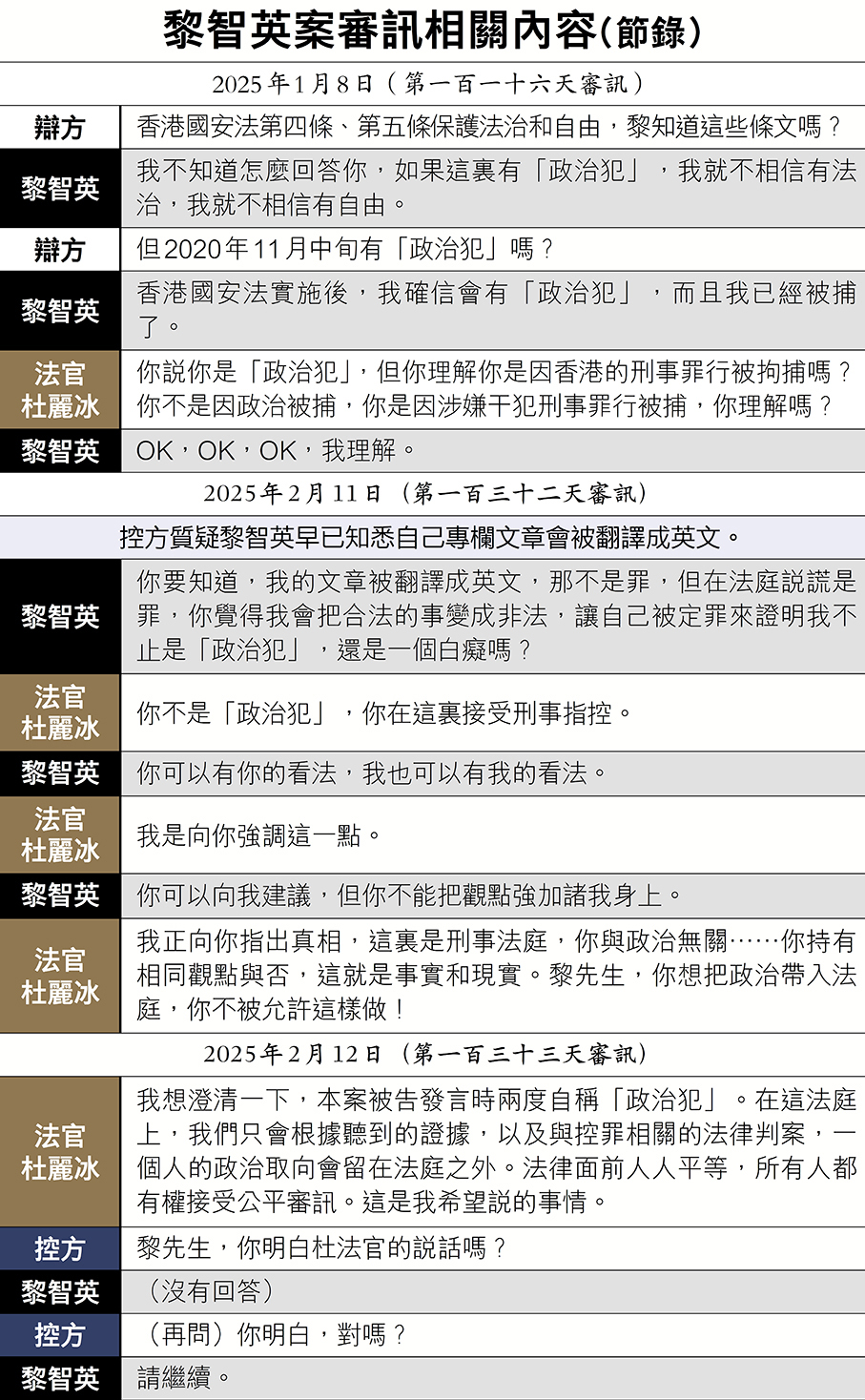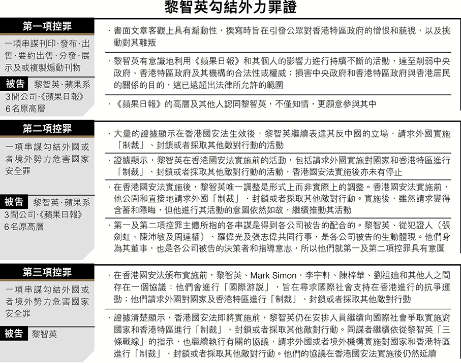 特區政府在去年高等法院原訟法庭裁決黎智英罪名成立後強調,法庭在裁決理由中已清楚表明,黎智英並非因其政治觀點或信念受審。法庭就本案頒下的裁決理由長達855頁,並完全公開供公眾查閱,當中已鉅細無遺地說明法庭對相關法律原則和證據的分析,以及裁定黎智英和3間被告公司有罪的理由。