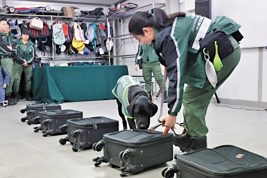 「從零基礎到正式上崗,偵緝犬需接受約4個月的系統訓練,通過多次評估、測試及模擬管制站場景的訓練,如轉盤、行李搜查、模擬旅客篩查、模擬貨車貨物搜查等,確保牠能準確識別目標氣味後,才正式上崗。當偵緝犬檢測到目標氣味時,會主動坐下示意,等待領犬員的食物獎勵,既確保檢測準確性,也避免滋擾旅客。」他介紹。
