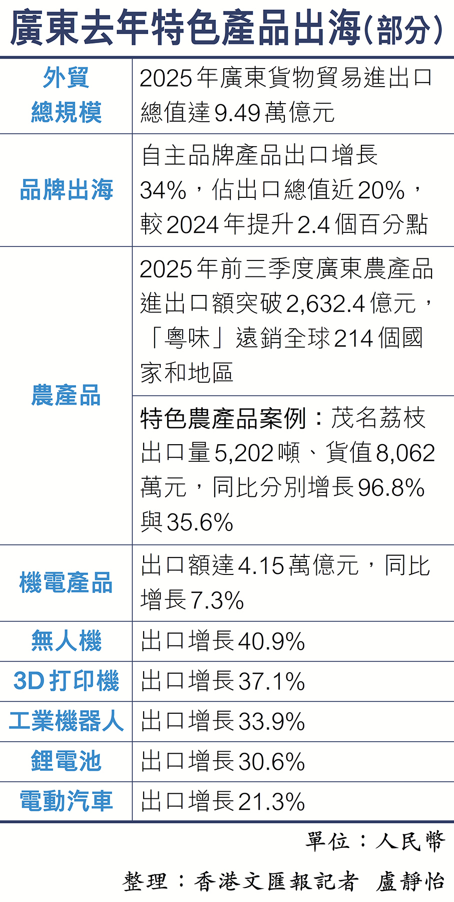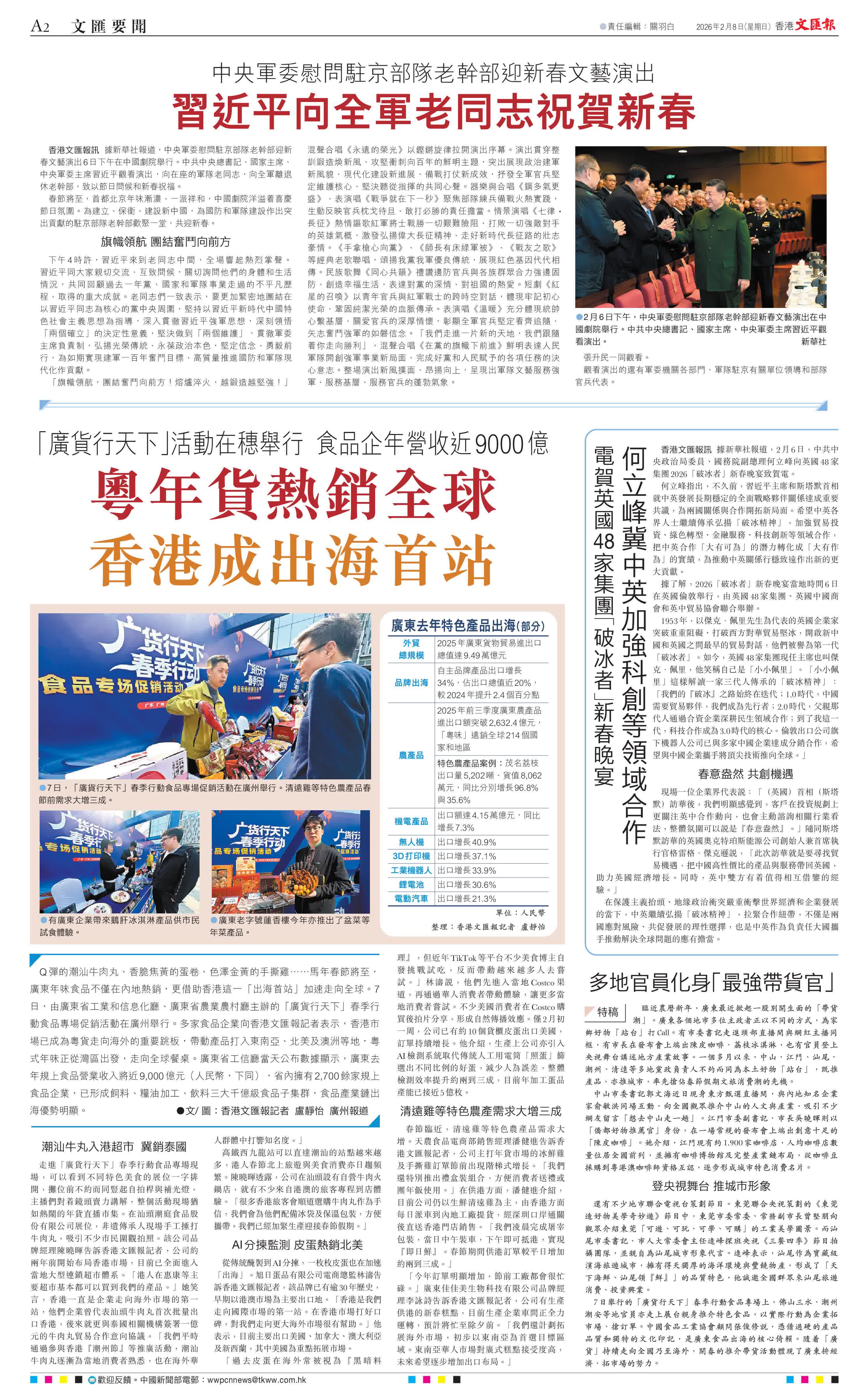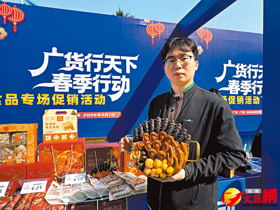 (香港文匯報記者 盧靜怡 廣州報道)Q彈的潮汕牛肉丸、香脆焦黃的蛋卷、色澤金黃的手撕雞……馬年春節將至,廣東年味食品不僅在內地熱銷,更借助香港這一「出海首站」加速走向全球。7日,由廣東省工業和信息化廳、廣東省農業農村廳主辦的「廣貨行天下」春季行動食品專場促銷活動在廣州舉行。多家食品企業向香港文匯報記者表示,香港市場已成為粵貨走向海外的重要跳板,帶動產品打入東南亞、北美及澳洲等地,粵式年味正從灣區出發,走向全球餐桌。廣東省工信廳當天公布數據顯示,廣東去年規上食品營業收入將近9,000億元(人民幣,下同),省內擁有2,700餘家規上食品企業,已形成飼料、糧油加工、飲料三大千億級食品子集群,食品產業鏈出海優勢明顯。