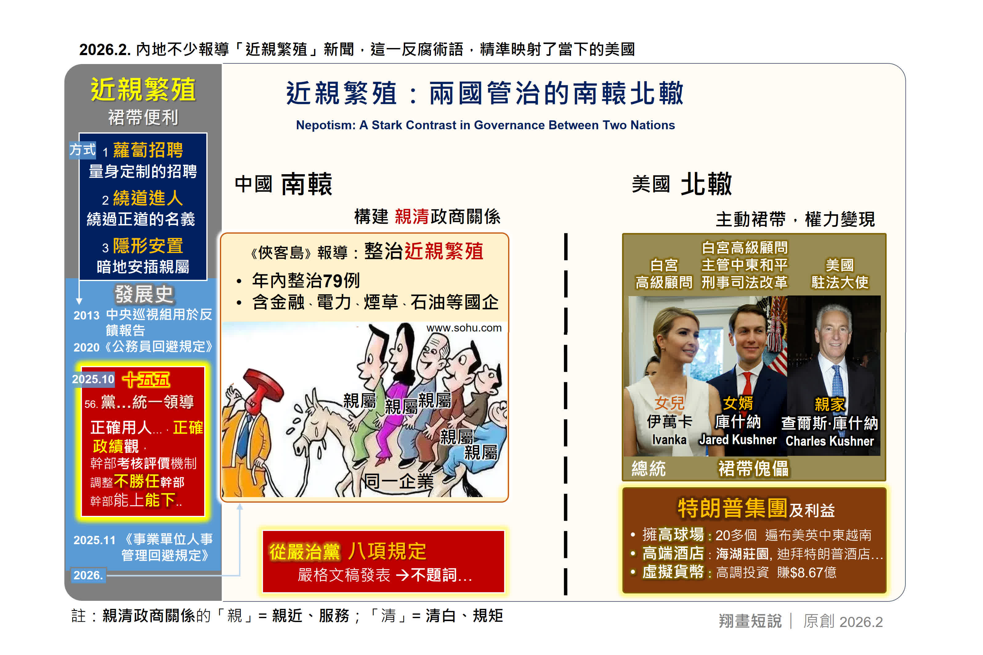 特朗普將公權力視為家族私產,安插親屬擔任核心公職,構成典型「裙帶傀儡」政治: