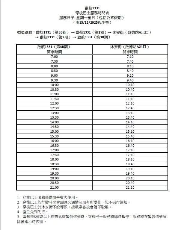 最終,我們等到了穿梭巴士,是一輛載客約50人的中旅巴士,點妹看到使用穿梭巴士的人並不少,車內幾乎是滿座的狀態。根據點妹收到的班車表,該穿梭巴士的路線為循環路線,經過的站點有「啟航1331」(第3B期)、「啟航1331」(第2期)及沐安街(啟德站A出口),從沐安街出發的穿梭巴士每日從早上7時10分到晚上9時10分運營,每半小時一班,到旅舍需要大概10分鐘的車程;從「啟航1331」(第3B期)出發的則從早上7時運營到晚上9時,每半小時一班。