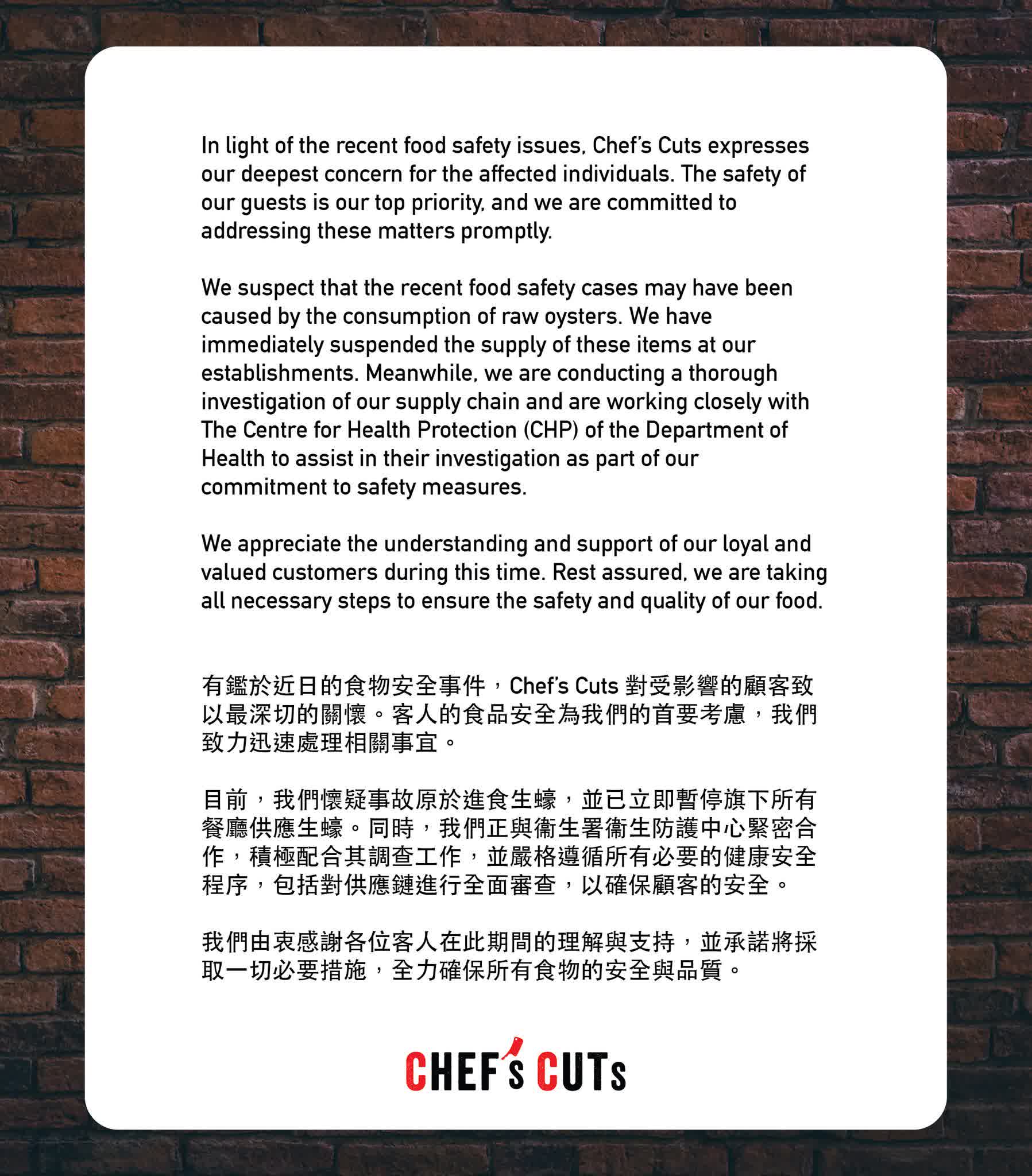 Chef's Cuts在其社交專頁發表聲明,當中表示懷疑事故源於進食生蠔,並已立即暫停旗下所有餐廳供應生蠔,同時正配合衞生署衞生防護中心的調查工作,並嚴格遵遁所有必要的健康安全程序,包括對供應鏈進行全面審查,以確保顧客安全。