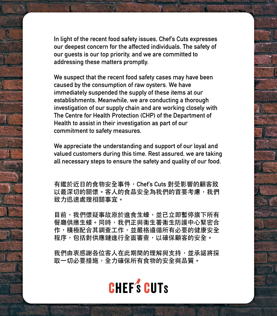 CHEF's CUTs則在其社交專頁發聲明指已暫停旗下所有餐廳供應生蠔,以配合衞生防護中心的調查,並嚴格遵遁所有必要的健康安全程序,包括對供應鏈進行全面審查,以確保顧客安全。