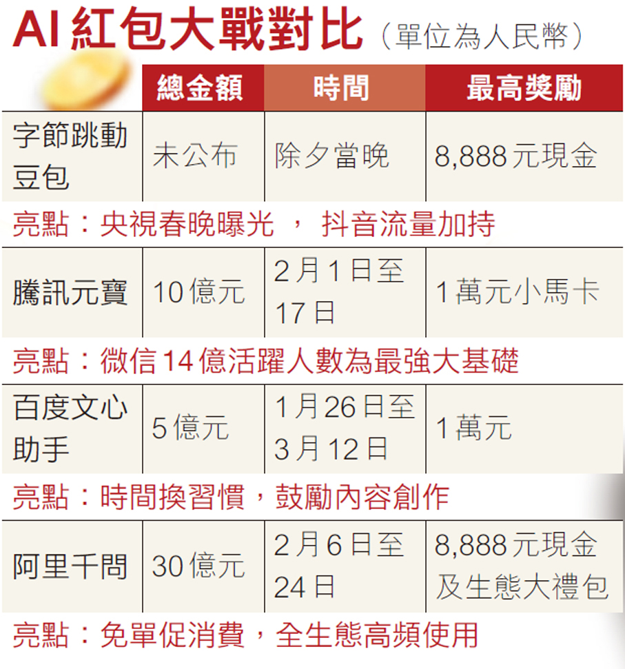 (香港文匯報記者 周曉菁)以數字紅包改寫市場競爭格局,向來是互聯網巨頭春節商戰戲碼。2015年春節,微信紅包曾以社交裂變之力,一舉改寫了移動支付市場的既定格局,標誌着「紅包」從傳統民俗符號,正式確立為數字商業競爭的戰略性槓桿與超級入口。11年後的2026年丙午龍年春節,當騰訊、阿里巴巴、字節跳動等巨頭再次為此投入重金時,一場總投入超過45億元(人民幣,下同)的「國產AI大模型紅包大戰」已然隆重上線。從央視春晚到家庭客廳,從拜年視頻到免單福利,這場以「紅包」為名的全民互動,實則是對AI助手、大模型應用與智能體生態的用戶入口、生態整合與底層算力的全面搶佔和較量。