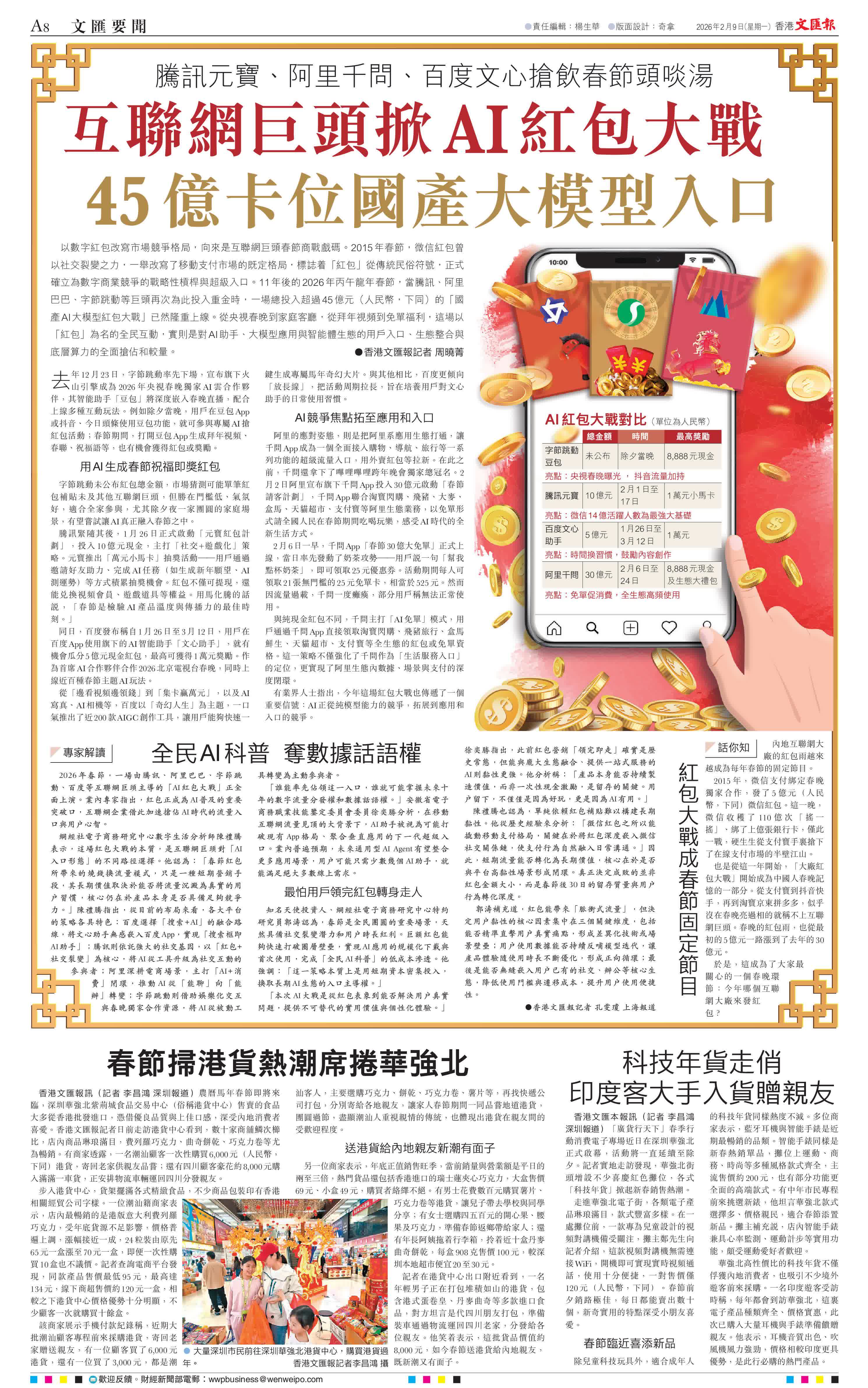 (香港文匯報記者 孔雯瓊 上海報道)2026年春節,一場由騰訊、阿里巴巴、字節跳動、百度等互聯網巨頭主導的「AI紅包大戰」正全面上演。業內專家指出,紅包正成為AI普及的重要突破口,互聯網企業借此加速搶佔AI時代的流量入口與用戶心智。