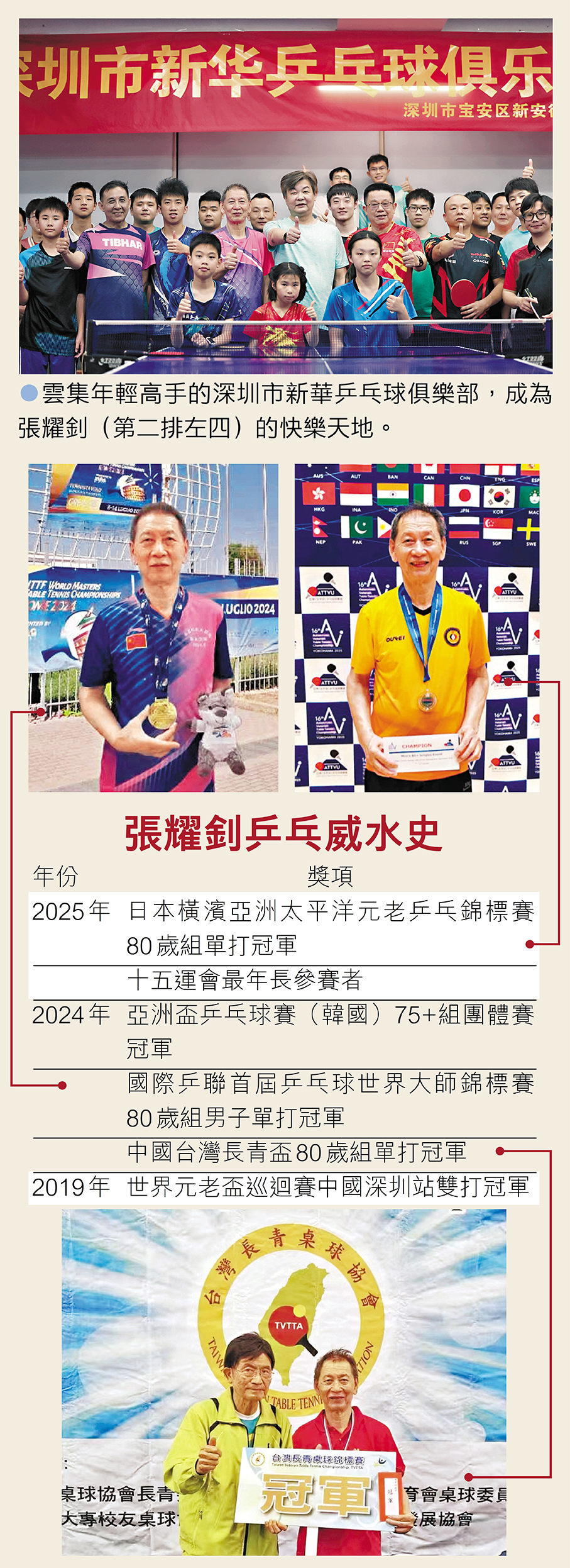 在深圳市新華乒乓球俱樂部,每到夜晚,球桌周圍總是熱鬧非凡:剛下班的上班族揮汗如雨,剛做完功課的中小學生興奮追球,而在這片年輕與活力的海洋中,一位髮鬢斑白、年過八十的長者卻格外醒目。他叫張耀釗,大家親切地喚他「釗哥」。這間乒乓球俱樂部是釗哥的「主場」,每逢星期二、四、六的比賽日,例必看到他的身影,十多年來風雨不改,「我大概66歲開始學打乒乓球,退休後沒事做,就去樓下看別人打波,看多了自己也想試試,一打就沉迷,日日都打兩三個鐘,在小區未必時時有人陪你打,心想不如參加比賽,就來到這間球館,一來就是十幾年。」