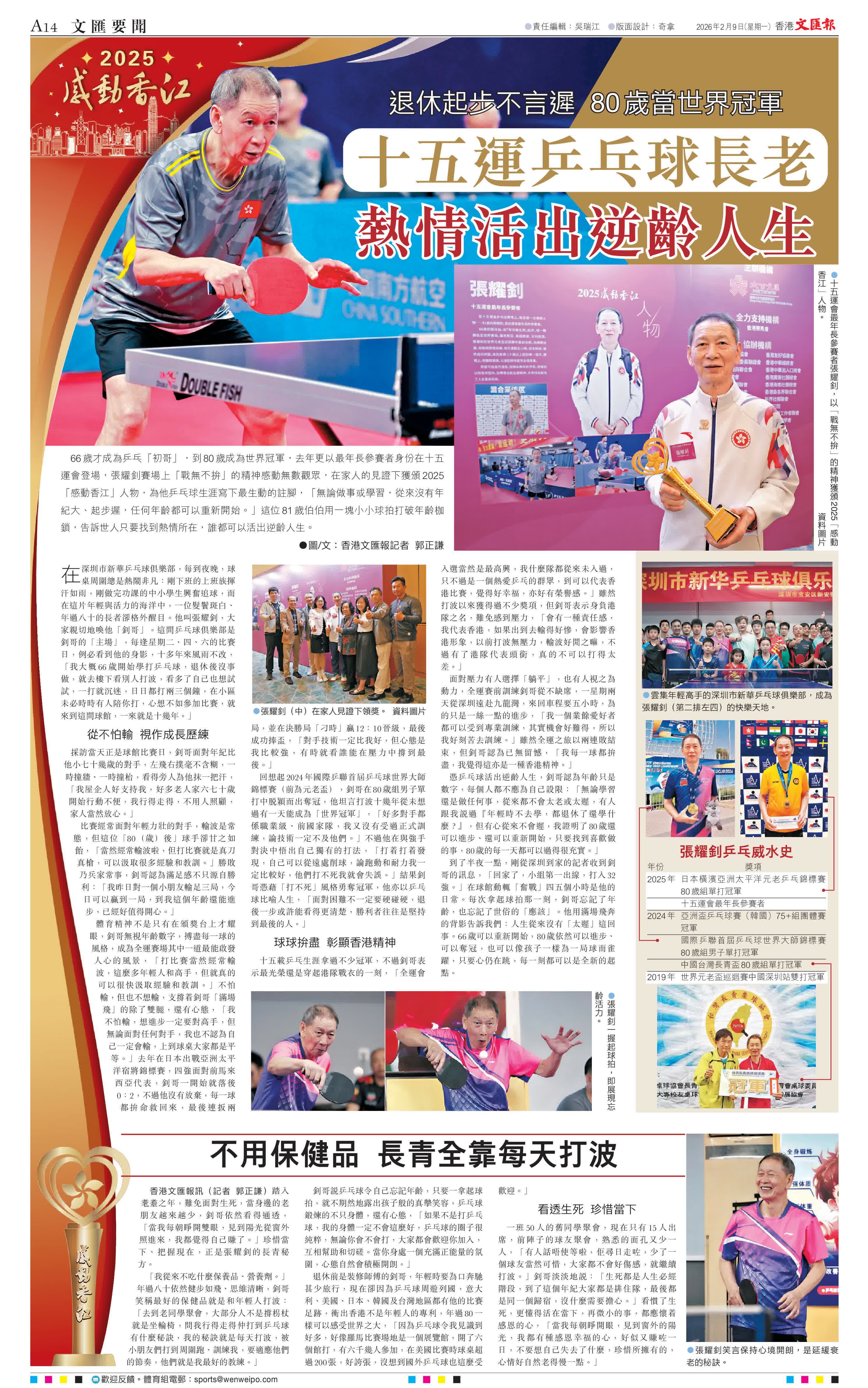(香港文匯報記者 郭正謙)66歲才成為乒乓「初哥」,到80歲成為世界冠軍,去年更以最年長參賽者身份在十五運會登場,張耀釗賽場上「戰無不拚」的精神感動無數觀眾,在家人的見證下獲頒2025「感動香江」人物,為他乒乓球生涯寫下最生動的註腳,「無論做事或學習,從來沒有年紀大、起步遲,任何年齡都可以重新開始。」這位81歲伯伯用一塊小小球拍打破年齡枷鎖,告訴世人只要找到熱情所在,誰都可以活出逆齡人生。