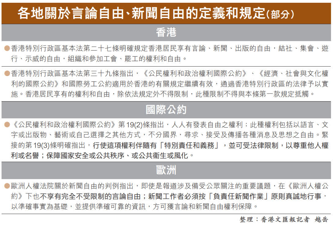 全國港澳研究會理事、法學教授傅健慈表示,從法理角度而言,任何國家的言論自由與新聞自由均非絕對權利,其行使必須在法律框架之內,不得危害國家安全、社會秩序及他人合法權益。國家憲法和香港國安法明確規定公民享有言論、出版自由,亦明確規定任何人行使權利時不得損害國家、社會、集體的利益和其他公民的合法自由與權利。