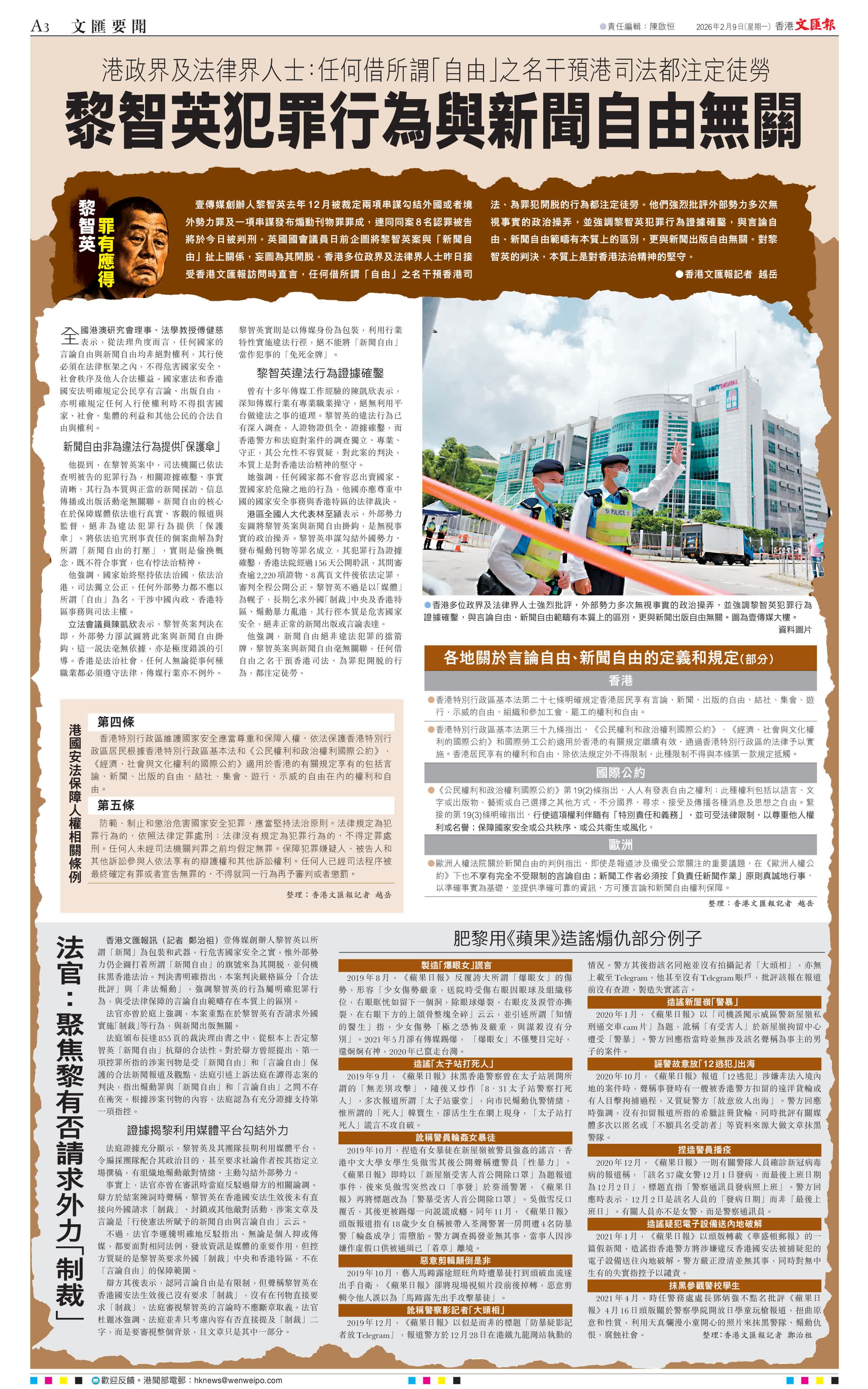 他提到,在黎智英案中,司法機關已依法查明被告的犯罪行為,相關證據確鑿、事實清晰,其行為本質與正當的新聞採訪、信息傳播或出版活動毫無關聯。新聞自由的核心在於保障媒體依法進行真實、客觀的報道與監督,絕非為違法犯罪行為提供「保護傘」。將依法追究刑事責任的個案曲解為對所謂「新聞自由的打壓」,實則是偷換概念,既不符合事實,也有悖法治精神。