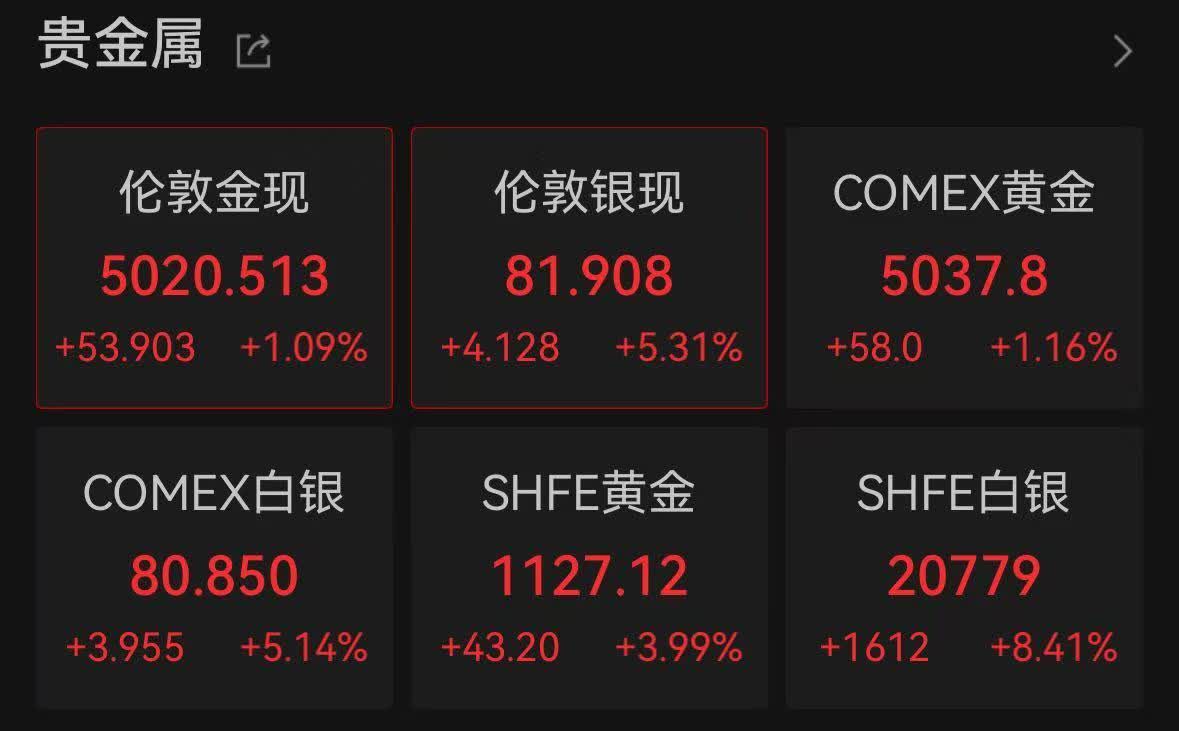 據財聯社消息,2月9日,現貨黃金漲1.26%,報5021.85美元/盎司;現貨白銀漲5.59%,報81.83美元/盎司。