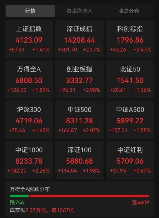 全市場超4600只個股上漲,全天成交額約2.27萬億元,較前一交易日有所放量。