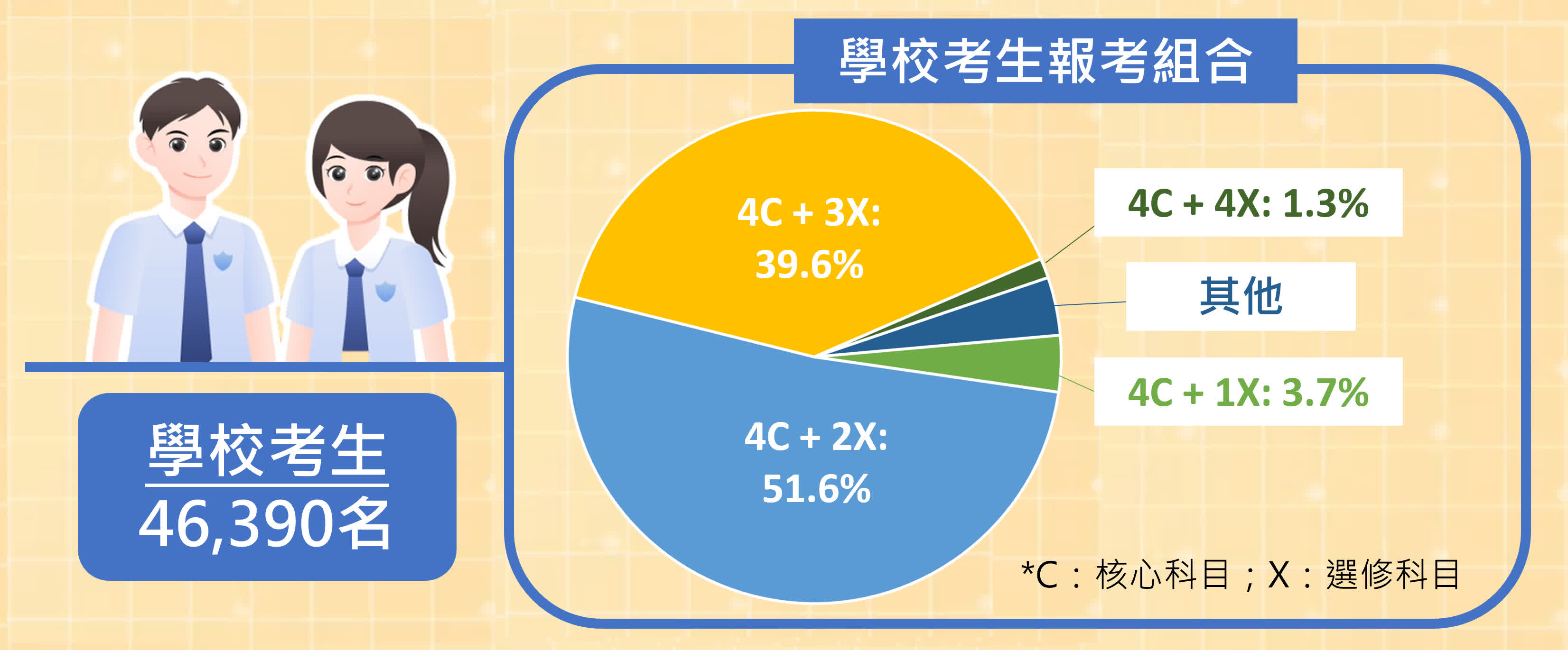 以報考科目組合計,今年DSE情況與2025年相若,近52%學校考生報考「4+2」,即在4個核心科以外,報考2個選修科,另有約40%考生報考3個選修科(4+3)。今年DSE 4個核心科與大部分選修科報考人數均有增加,選修科中以化學、生物及經濟最多人報考,前兩者都超過1.6萬人,後者亦有逾1.4萬人