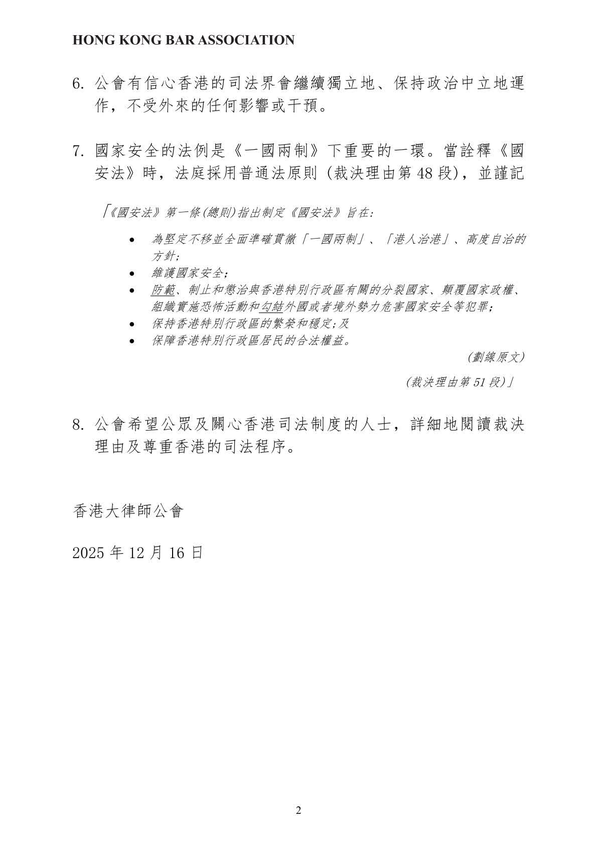 香港文匯報訊 香港大律師公會今日(9日)發表聲明,回應關於在《中華人民共和國香港特別行政區維護國家安全法》(《國安法》)下,勾結外國或者境外勢力危害國家安全罪的首宗裁決的判刑及傳媒的相關查詢。以下為全文: