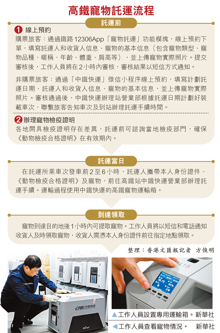 香港文匯報記者了解到,為保障寵物安全,託運使用專用的恒溫恒濕「航空箱」,並在高鐵列車上設置相對獨立的運輸空間,確保寵物運輸途中安全舒適。「航空箱」內配備360度監控系統,自帶新風系統及降噪、除味功能;內部鋪設寵物尿墊,並提供貓砂和飲用水。全程由經過專項培訓的工作人員隨車看護,實時監測「航空箱」的各項數據指標,並通過手機查看寵物實時狀態。一旦發現異常,工作人員會立即現場處置。