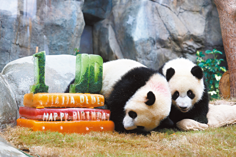 去年8月15日,「加加」、「得得」迎來一歲生日,海洋公園特別舉辦生日會,不少「粉絲」特別抱着大熊貓毛絨玩具與背景板上的卡通熊貓合影留念,香港特區政府文化體育及旅遊局局長羅淑佩表示,過去一年,大家見證着「加加」和「得得」健康快樂成長,感到無比喜悅與感動,牠們不論是翻跟斗,還是與護理員的互動,都融化了無數市民和旅客的心。