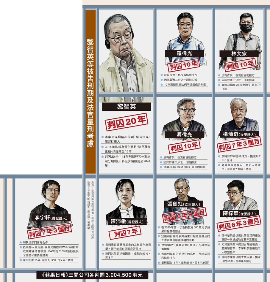 關於黎智英的判刑方面,法庭裁定黎智英是各項串謀的幕後主腦和推動者,故此將其量刑起點提高:串謀發布煽動刊物罪在原本21個月的量刑起點上增加兩個月,初步定出監禁23個月的暫定刑罰;另外兩罪串謀勾結外國或者境外勢力,則在原本15年的量刑起點上增加3年,初步定出監禁18年的暫定刑罰。