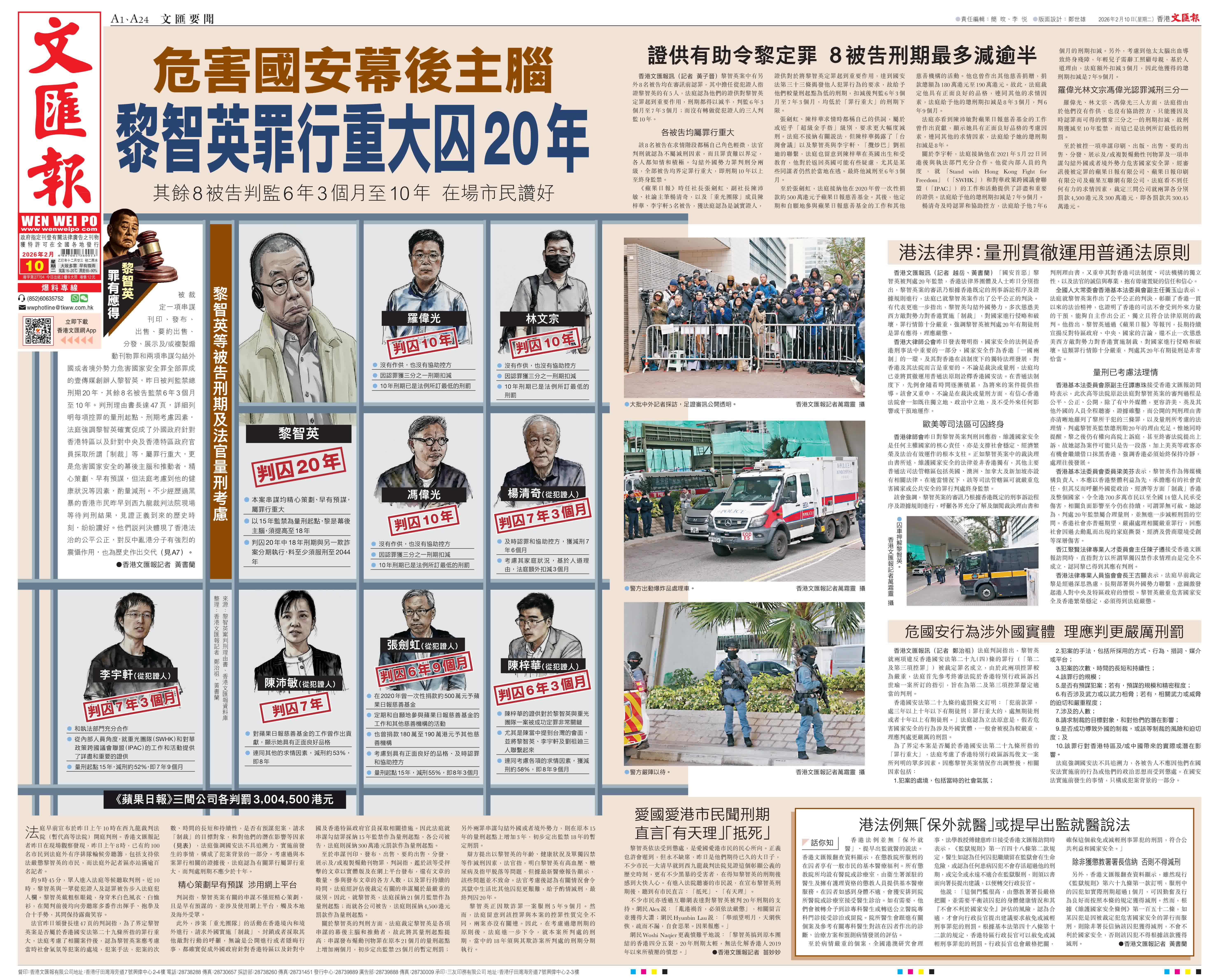 (香港文匯報記者 黃書蘭)被裁定一項串謀刊印、發布、出售、要約出售、分發、展示及/或複製煽動刊物罪和兩項串謀勾結外國或者境外勢力危害國家安全罪全部罪成的壹傳媒創辦人黎智英,昨日被判監禁總刑期20年,其餘8名被告監禁6年3個月至10年。判刑理由書長達47頁,詳細列明每項控罪的量刑起點、刑期考慮因素,法庭強調黎智英確實促成了外國政府針對香港特區以及針對中央及香港特區政府官員採取所謂「制裁」等,屬罪行重大,更是危害國家安全的幕後主腦和推動者,精心策劃、早有預謀,但法庭考慮到他的健康狀況等因素,酌量減刑。不少經歷過黑暴的香港市民昨早到西九龍裁判法院現場等待判刑結果,見證正義到來的歷史時刻,紛紛讚好。他們說判決體現了香港法治的公平公正,對反中亂港分子有強烈的震懾作用,也為歷史作出交代。