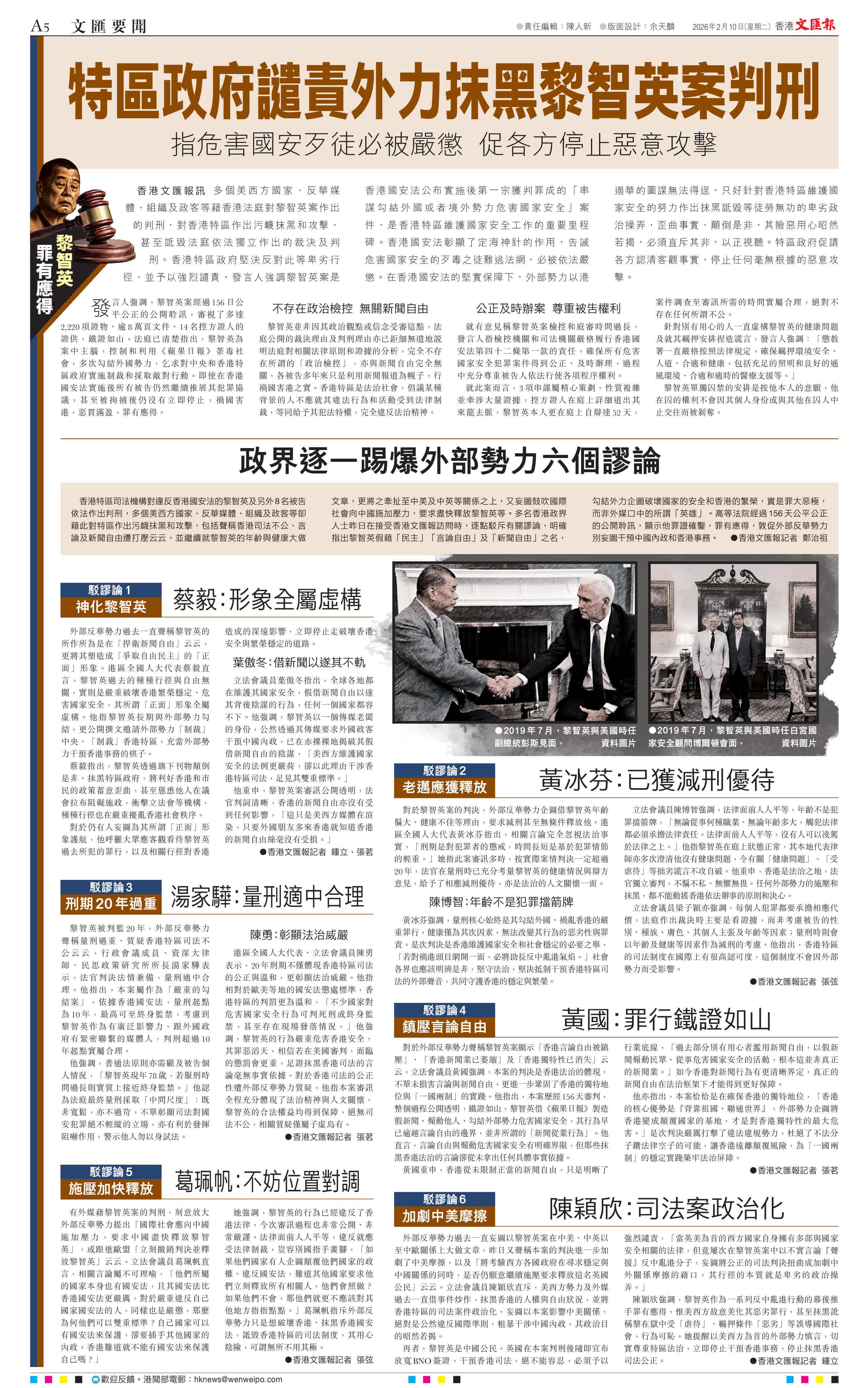 黎智英並非因其政治觀點或信念受審這點,法庭公開的裁決理由及判刑理由亦已鉅細無遺地說明法庭對相關法律原則和證據的分析,完全不存在所謂的「政治檢控」,亦與新聞自由完全無關,各被告多年來只是利用新聞報道為幌子,行禍國害港之實。香港特區是法治社會,倡議某種背景的人不應就其違法行為和活動受到法律制裁,等同給予其犯法特權,完全違反法治精神。