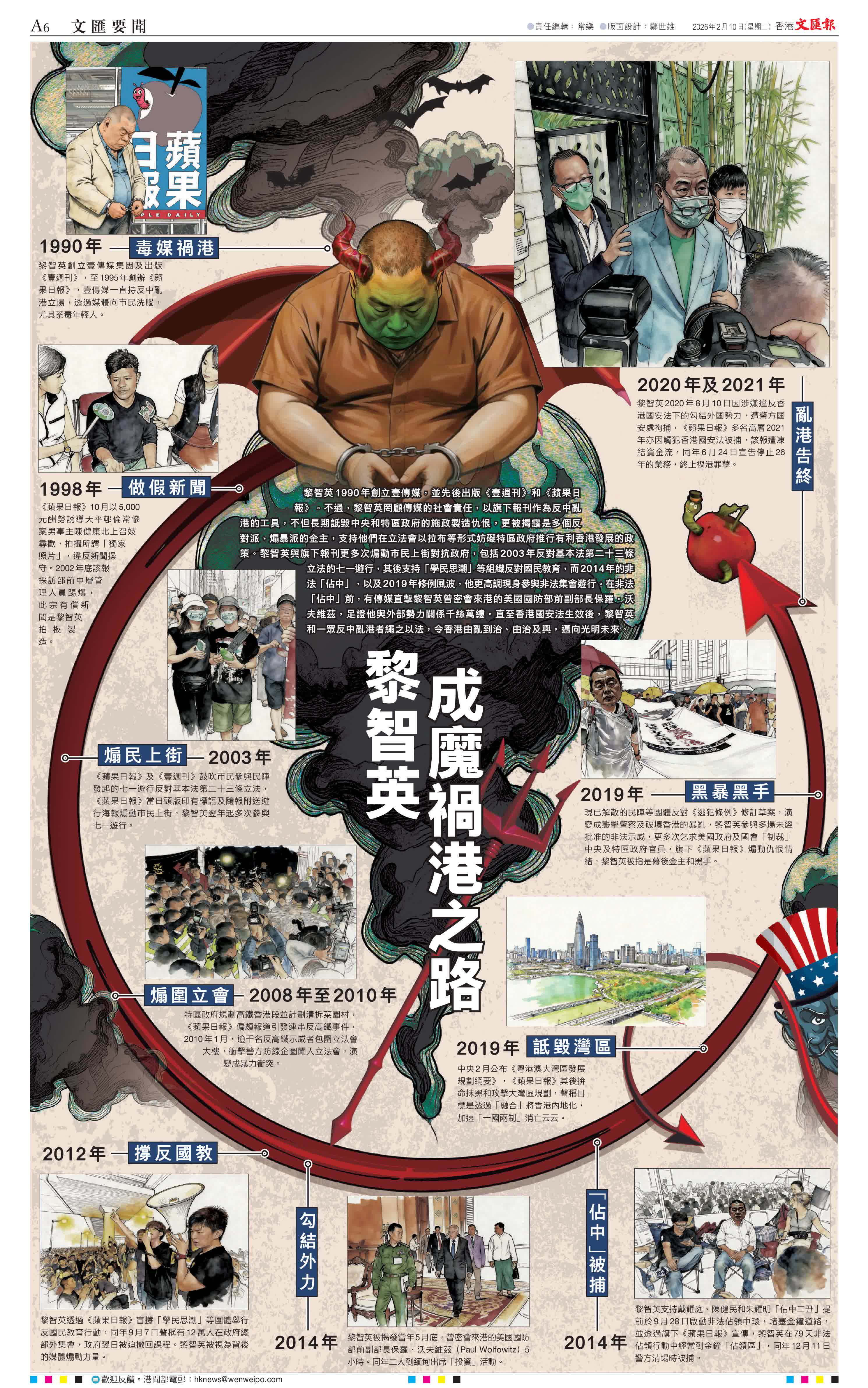 黎智英1990年創立壹傳媒,並先後出版《壹週刊》和《蘋果日報》。不過,黎智英罔顧傳媒的社會責任,以旗下報刊作為反中亂港的工具,不但長期詆毀中央和特區政府的施政製造仇恨,更被揭露是多個反對派、煽暴派的金主,支持他們在立法會以拉布等形式妨礙特區政府推行有利香港發展的政策。黎智英與旗下報刊更多次煽動巿民上街對抗政府,包括2003年反對基本法第二十三條立法的七一遊行,其後支持「學民思潮」等組織反對國民教育,而2014年的非法「佔中」,以及2019年修例風波,他更高調現身參與非法集會遊行。在非法「佔中」前,有傳媒直擊黎智英曾密會來港的美國國防部前副部長保羅·沃夫維茲,足證他與外部勢力關係千絲萬縷。直至香港國安法生效後,黎智英和一眾反中亂港者繩之以法,令香港由亂到治、由治及興,邁向光明未來。