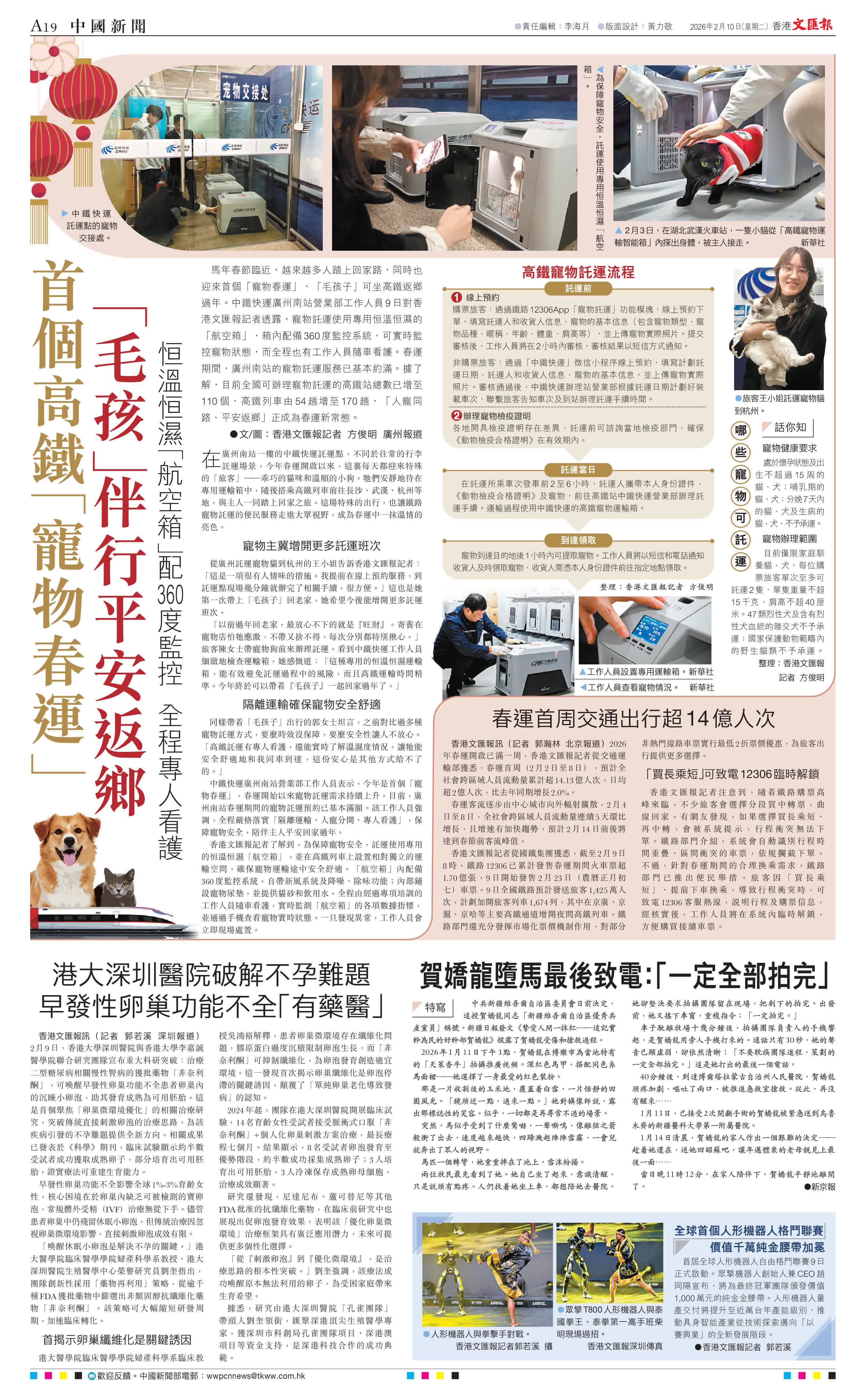 (香港文匯報記者 方俊明 廣州報道)馬年春節臨近,越來越多人踏上回家路,同時也迎來首個「寵物春運」,「毛孩子」可坐高鐵返鄉過年。中鐵快運廣州南站營業部工作人員9日對香港文匯報記者透露,寵物託運使用專用恒溫恒濕的「航空箱」,箱內配備360度監控系統,可實時監控寵物狀態,而全程也有工作人員隨車看護。春運期間,廣州南站的寵物託運服務已基本約滿。據了解,目前全國可辦理寵物託運的高鐵站總數已增至110個,高鐵列車由54趟增至170趟,「人寵同路、平安返鄉」正成為春運新常態。