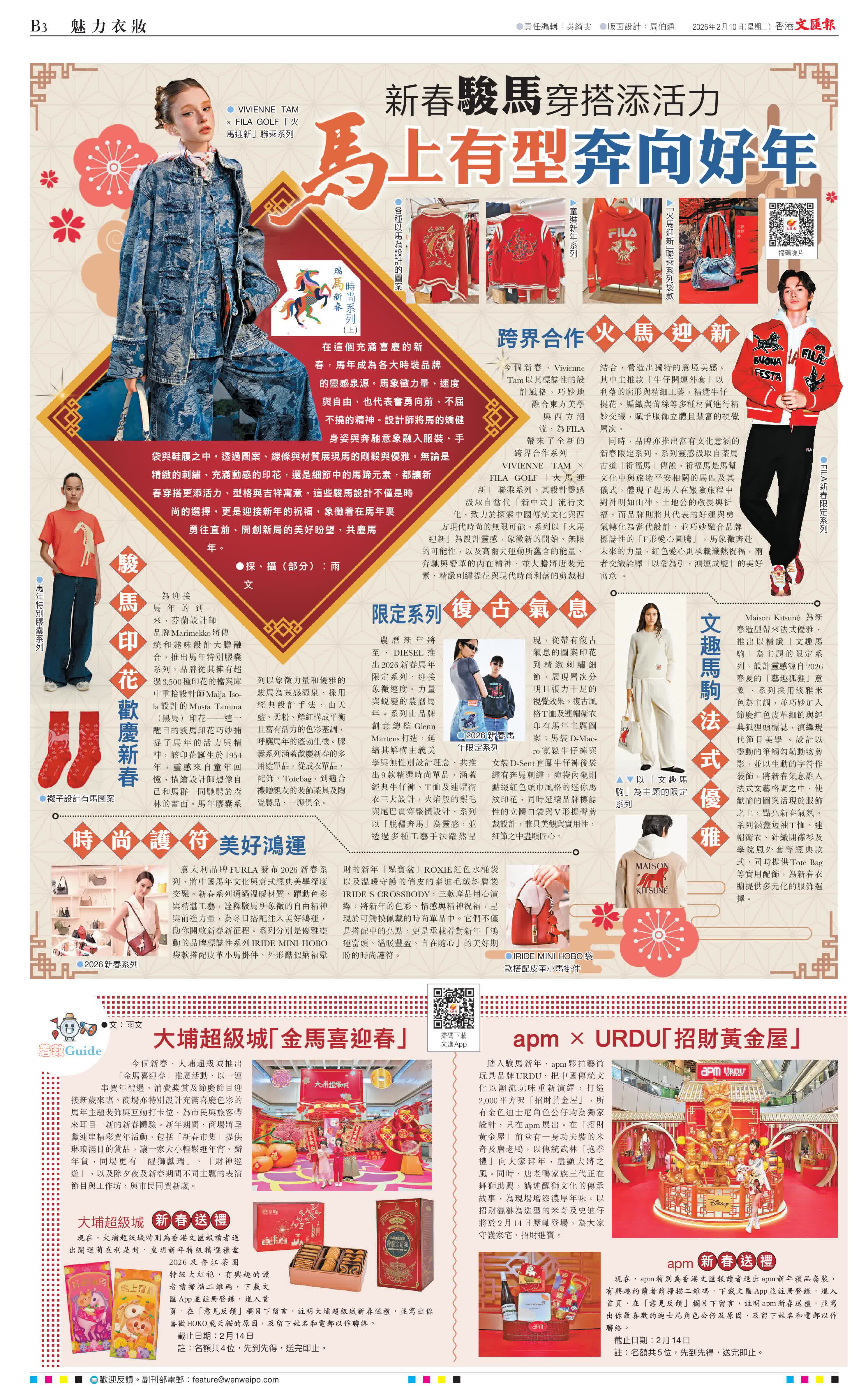 (香港文匯報記者 雨文)在這個充滿喜慶的新春,馬年成為各大時裝品牌的靈感泉源。馬象徵力量、速度與自由,也代表奮勇向前、不屈不撓的精神。設計師將馬的矯健身姿與奔馳意象融入服裝、手袋與鞋履之中,透過圖案、線條與材質展現馬的剛毅與優雅。無論是精緻的刺繡、充滿動感的印花,還是細節中的馬蹄元素,都讓新春穿搭更添活力、型格與吉祥寓意。這些駿馬設計不僅是時尚的選擇,更是迎接新年的祝福,象徵着在馬年裏勇往直前、開創新局的美好盼望,共慶馬年。