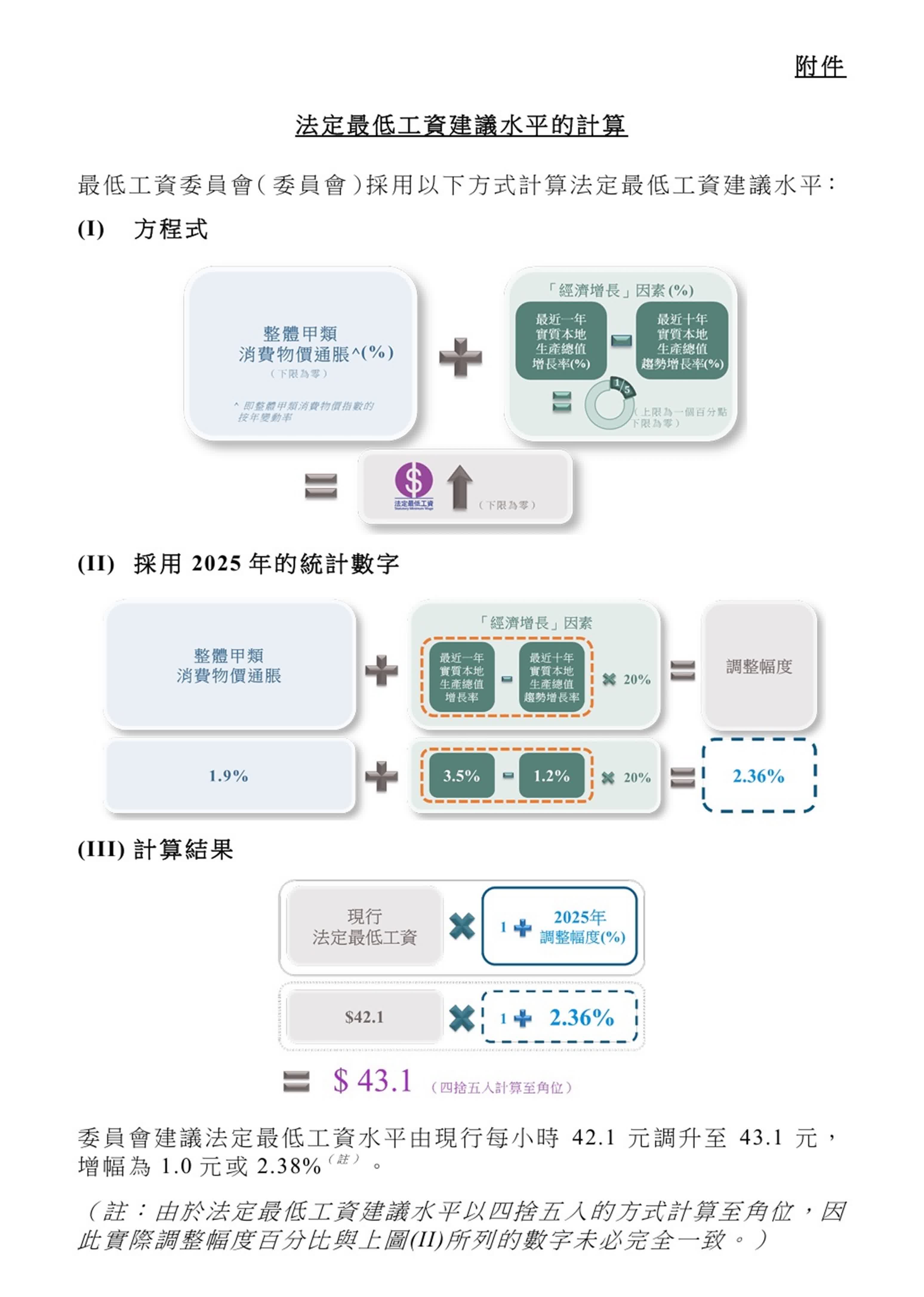 委員會按法定最低工資「一年一檢」新機制,採用行政長官會同行政會議通過的方程式進行檢討,建議法定最低工資的新水平(見附件)。