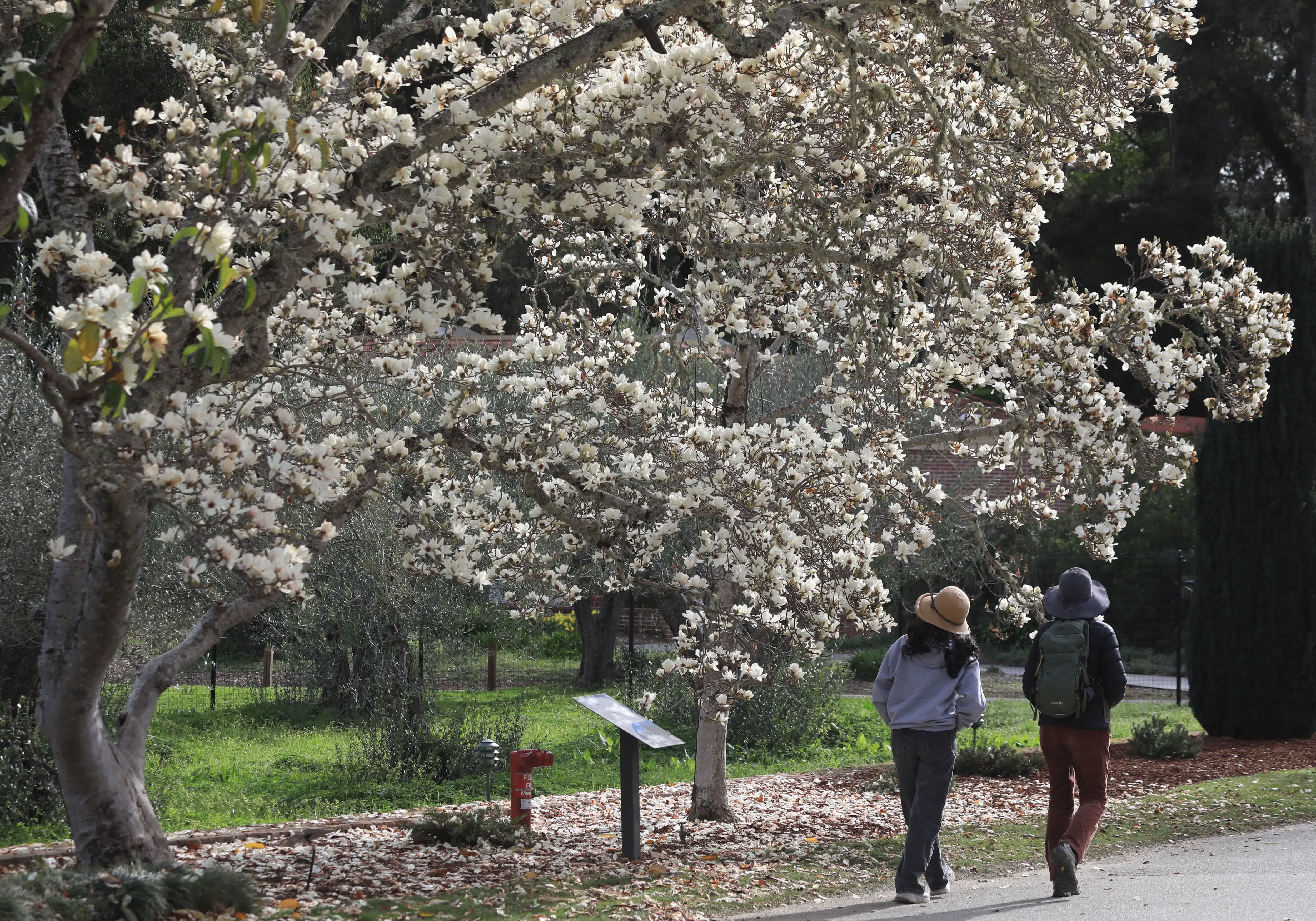 2月9日,遊客在美國加利福尼亞州舊金山灣區伍德賽德的斐洛里花園賞花、休閒。(新華社)