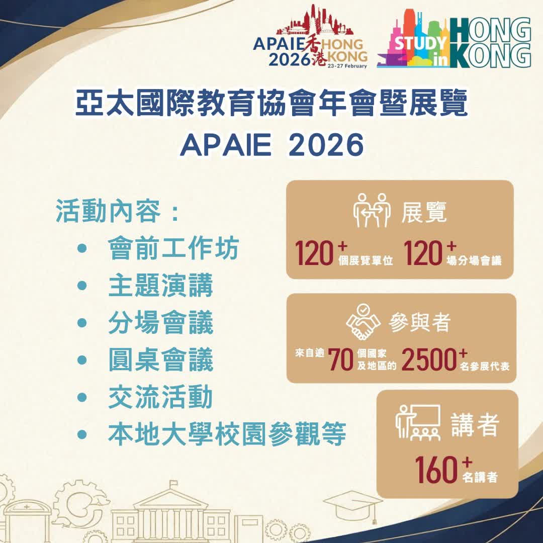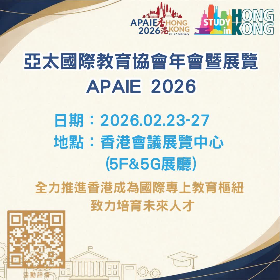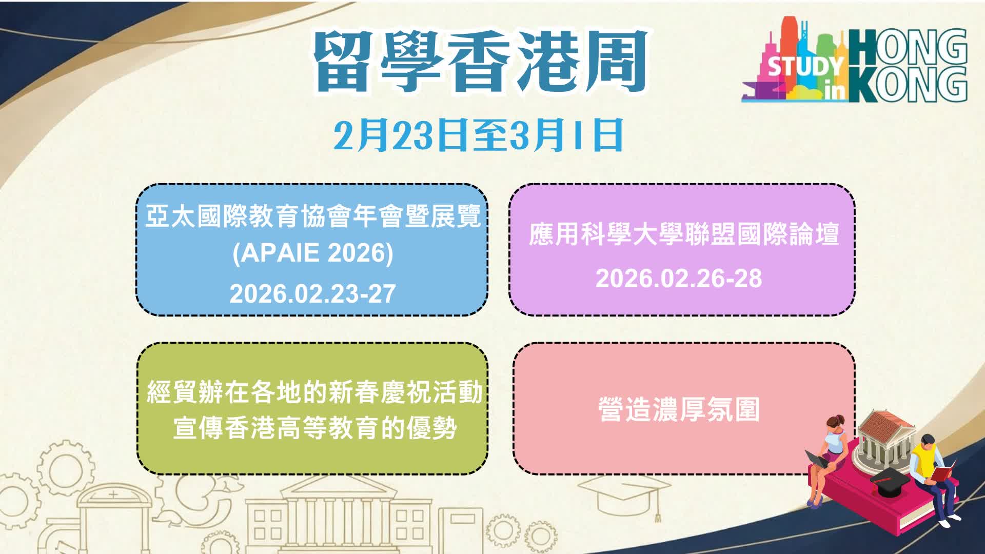 她指出,期間最受矚目的活動為2月23日至27日舉行的「亞太國際教育協會年會暨展覽(APAIE 2026)」。蔡若蓮表示,APAIE為全球三大國際教育盛會之一,預料將吸引逾2,000位國際教育領袖與專家學者齊聚香港,共同探討高等教育最新趨勢及重要議題。屆時,八所「大學教育資助委員會資助大學」將聯手設立「留學香港」展覽攤位,攜手推廣「留學香港」品牌,展示香港專上教育的卓越成就,並提升本地大學的國際地位。