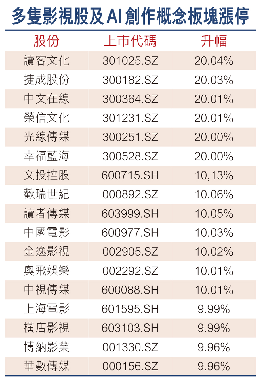 昨日,在Seedance 2.0的帶動下,A股最火熱的板塊為傳媒板塊,包括中文在線、掌閱科技和華數傳媒等近20隻個股漲停。同時,一些影視個股也跟風上漲,AI應用題材全線上揚,包括短劇遊戲、虛擬人、網絡安全等一些個股也普遍上漲。