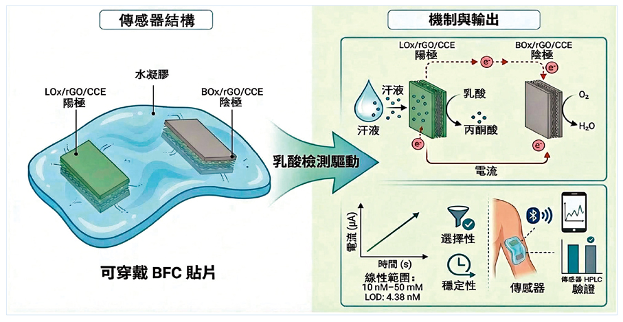 能量自給自足:都大科技學院團隊研發的「自供電可穿戴電化學傳感器」創新技術,在檢測汗液乳酸時,利用生物化學反應所產生的電子為傳感器供電,使傳感器無須外接電源,並透過藍牙技術將檢測結果同步至智能手機(見圖)。根據團隊早前於實驗室對運動員進行的測試,此技術用於實時監測運動員皮膚汗液的乳酸濃度時,與傳統檢測方法相比,誤差值僅為±5%。