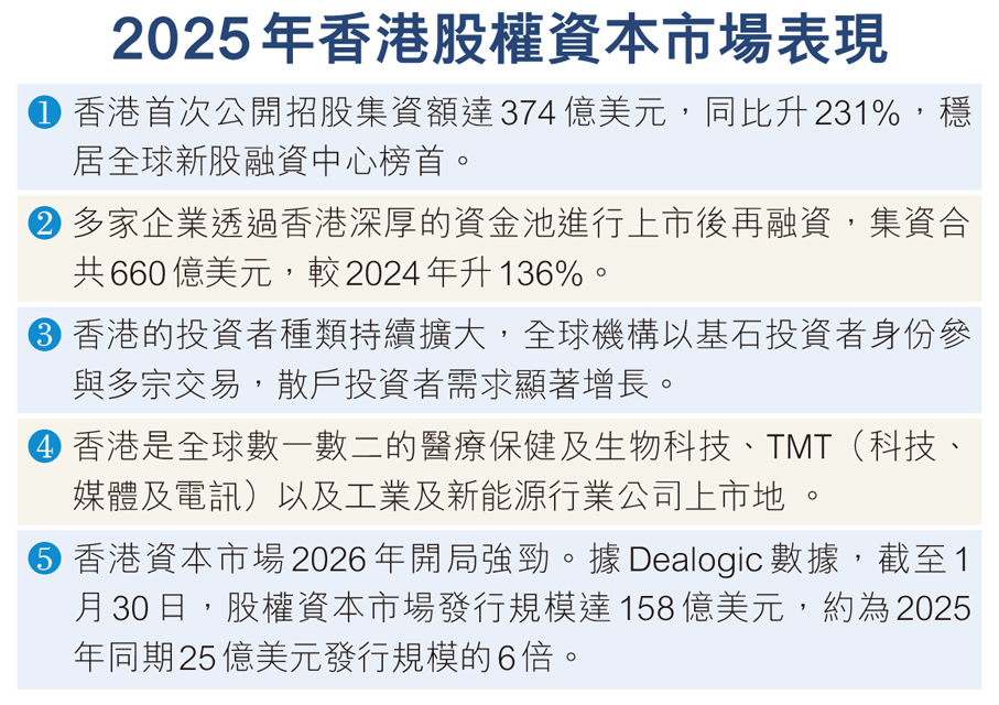 港交所指出,踏入2026年,香港資本市場開局強勁。根據Dealogic的數據,截至1月30日,股權資本市場發行規模達158億美元,約為2025年同期25億美元發行規模的6倍(即是增加5倍)。人工智能領域的公司在香港IPO活動中佔了很大比例,為香港構建充滿活力的人工智能發行人生態圈奠定了重要基礎,也為投資者提供了更多投資領先創新公司的機遇。