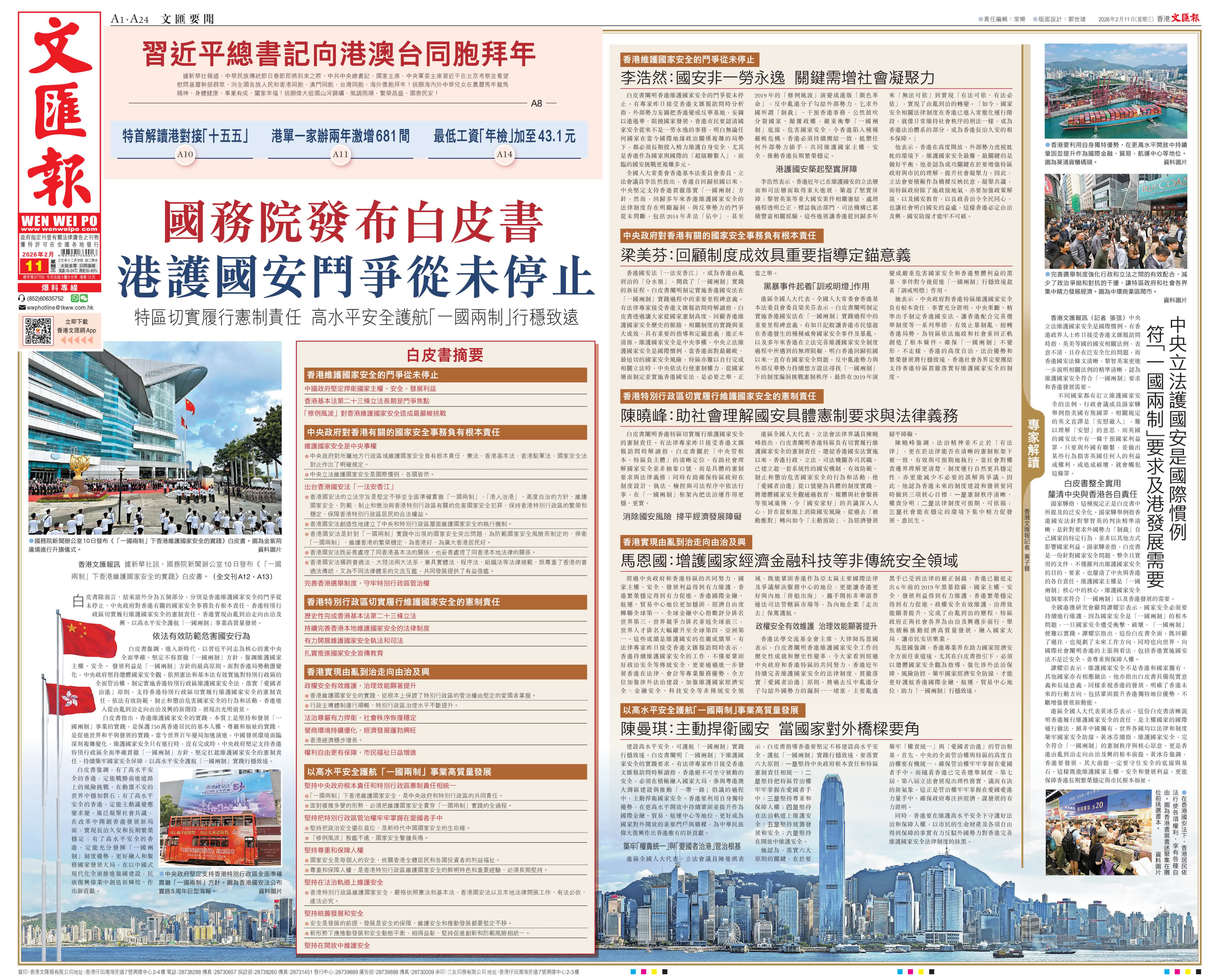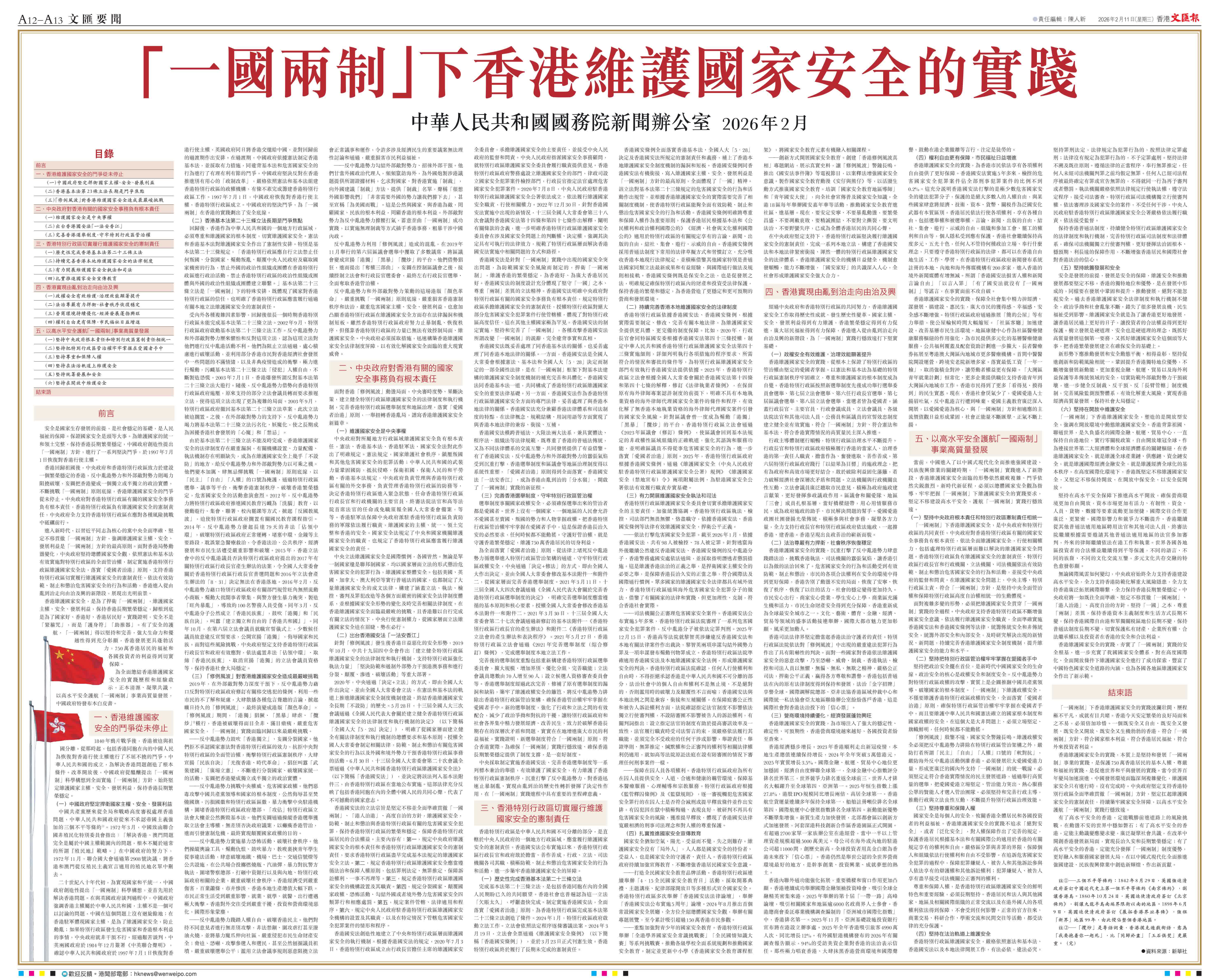 香港文匯報訊 據新華社訊,國務院新聞辦公室10日發布《「一國兩制」下香港維護國家安全的實踐》白皮書。