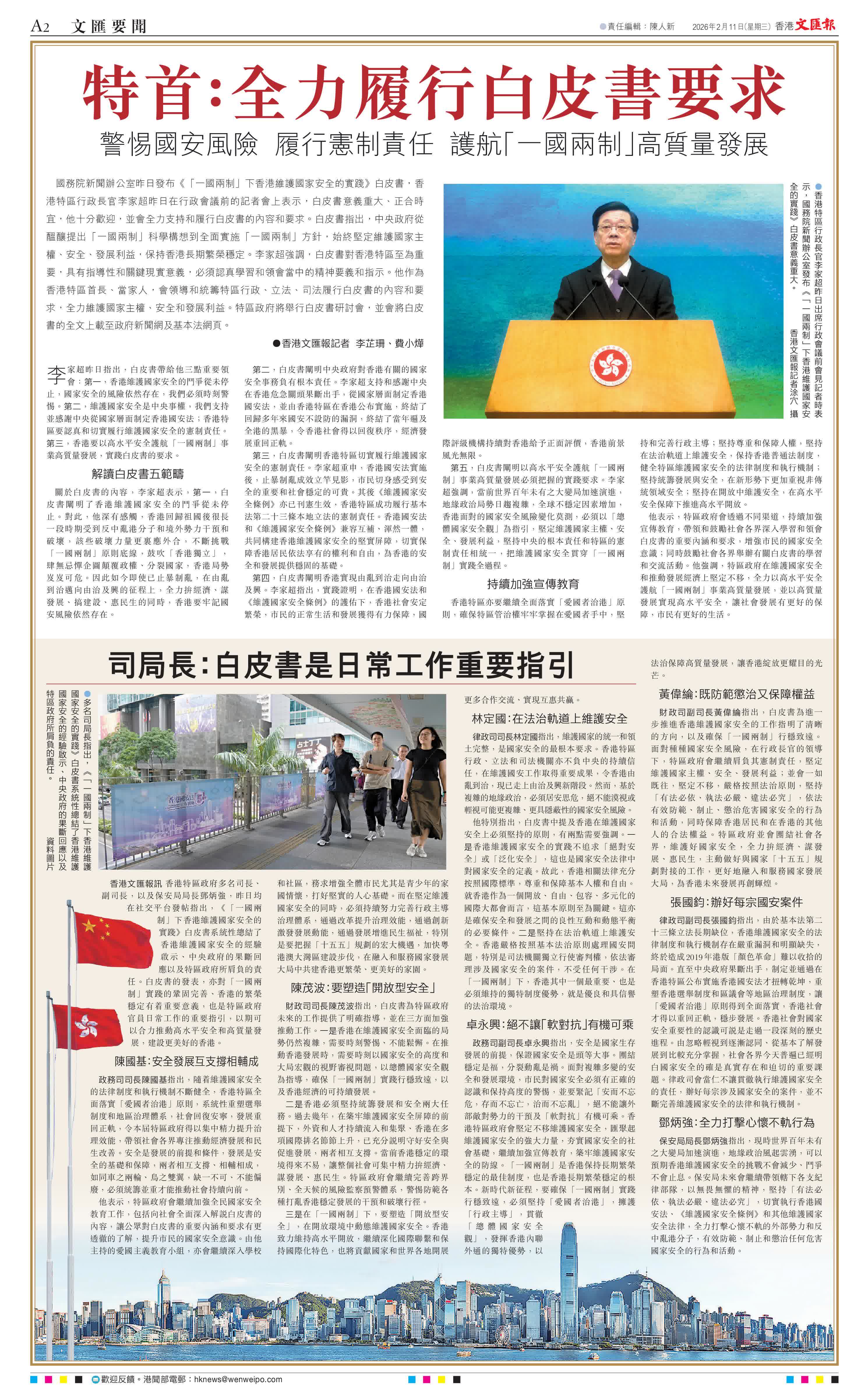 他表示,特區政府會透過不同渠道,持續加強宣傳教育,帶領和鼓勵社會各界深入學習和領會白皮書的重要內涵和要求,增強市民的國家安全意識;同時鼓勵社會各界舉辦有關白皮書的學習和交流活動。他強調,特區政府在維護國家安全和推動發展經濟上堅定不移,全力以高水平安全護航「一國兩制」事業高質量發展,並以高質量發展實現高水平安全,讓社會發展有更好的保障,市民有更好的生活。