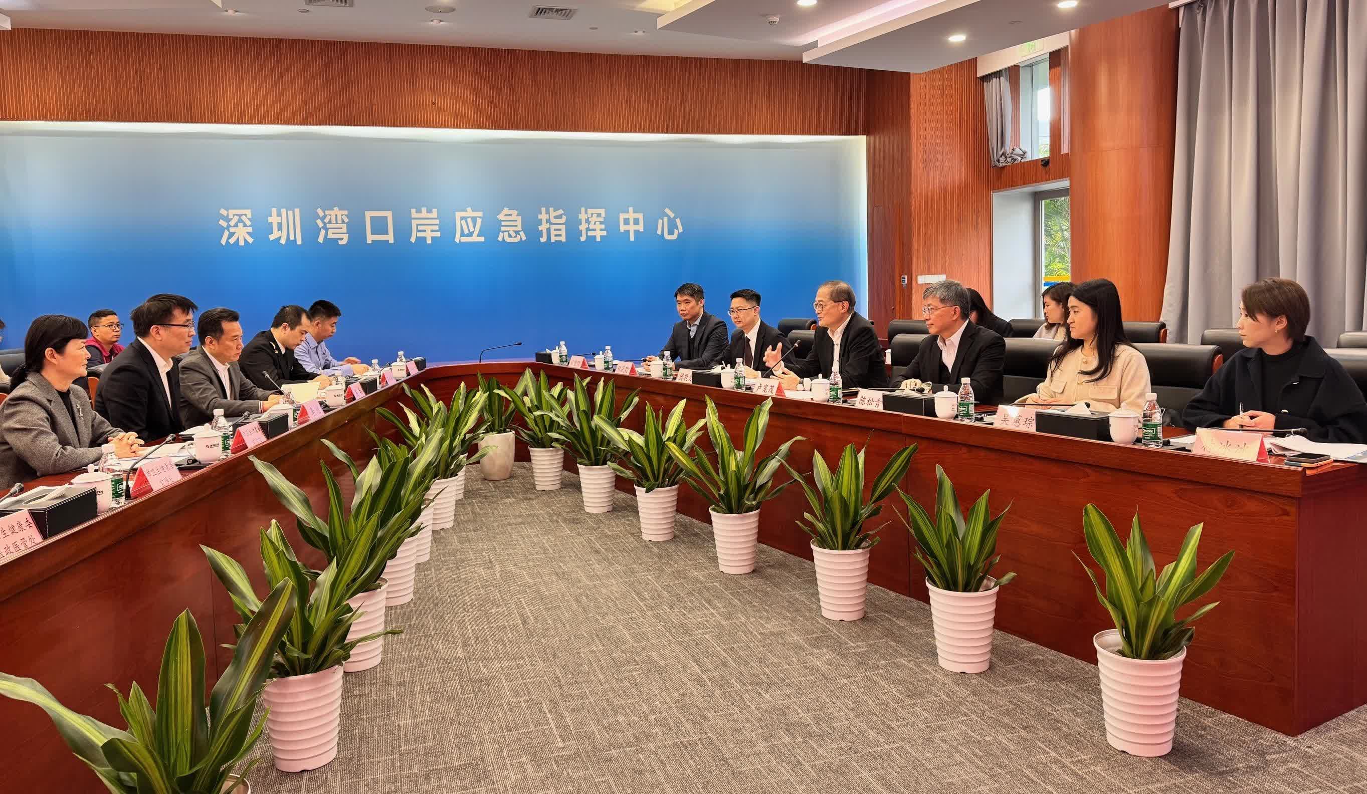 醫務衞生局局長盧寵茂今日到訪深圳,與廣東省和深圳市政府的衞生和口岸辦官員會面,持續深化與內地,特別是大灣區內地城市在醫療衞生方面的跨境協作。盧寵茂教授首先與深圳市衞生健康委員會(衞健委)副主任李創、深圳市人民政府口岸辦公室(深圳口岸辦)二級巡視員吳兵,以及深圳海關和深圳出入境邊防檢查總站(深圳邊檢總站)代表進行會談,衞生署控煙酒辦公室代表亦在會上簡介香港特別行政區(特區)政府的控煙方向及政策。