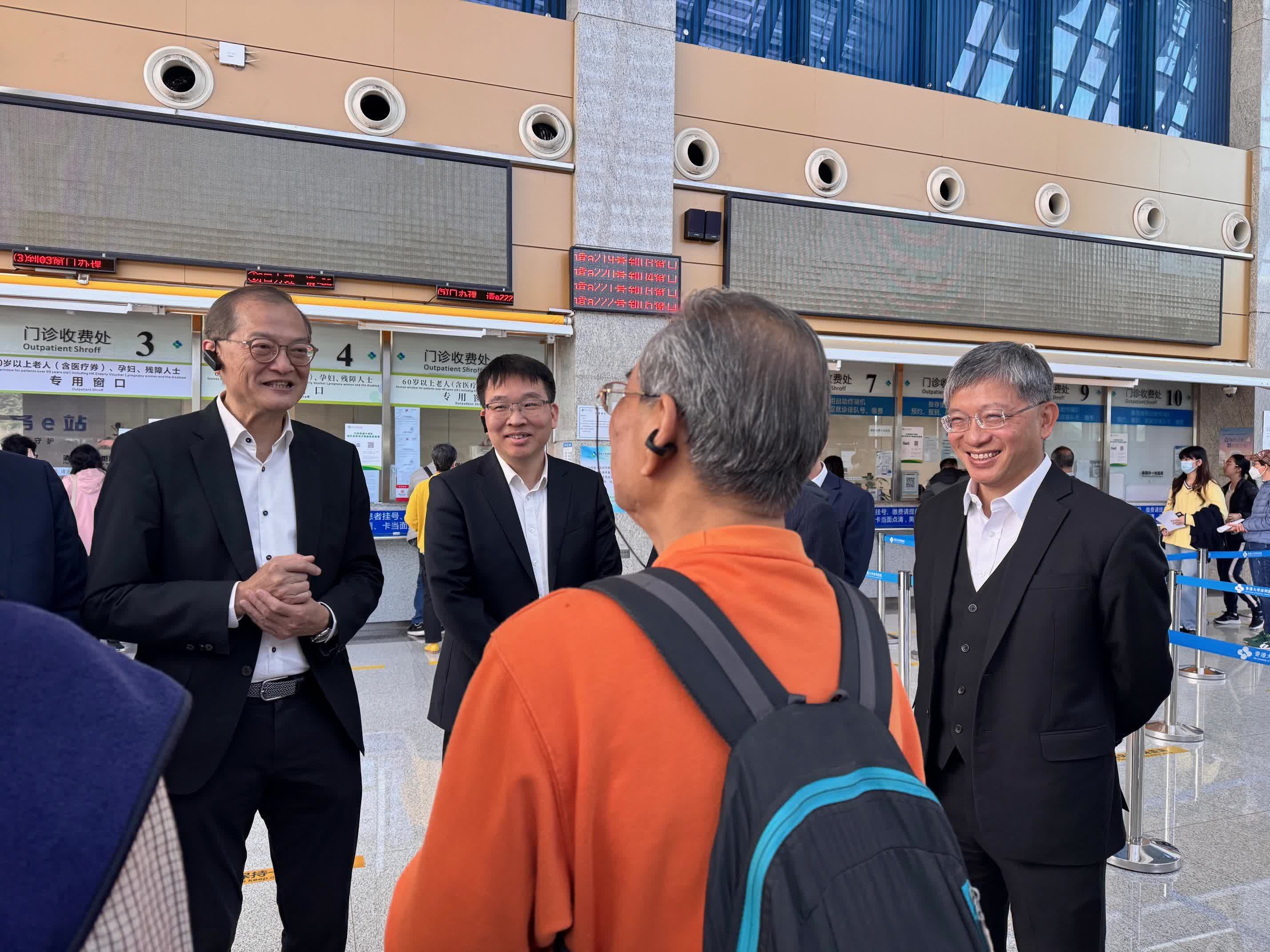 盧寵茂其後與廣東省衞健委副主任鄧林峰到香港大學深圳醫院(港大深圳醫院)調研跨境醫療措施的實際使用情況,並參觀港大深圳醫院二期建設。盧寵茂表示︰「醫衞局自二○二四年七月起以港大深圳醫院作試點推行醫健通流動應用程式的『跨境健康紀錄』及『個人資料夾』功能,在自攜病歷的原則下,便利香港市民安全地跨境使用電子健康紀錄。兩項功能自二○二四年九月起擴展至『長者醫療券大灣區試點計劃』下的19間醫療機構。由今年一月起,我們實現進一步突破,讓市民可透過『個人資料夾』功能授權三間大灣區醫院直接存入一些較難自行上傳的放射檢查報告及影像至個人醫健通戶口,從而更便捷和安全地保存和運用境外就醫時的電子健康紀錄,以獲得更連貫的護理服務。我們期望與廣東省衞健委繼續合力推展跨境醫療紀錄互通,務求更有效地支援市民的跨境醫療需求,提升跨境醫護服務的質量安全。」
