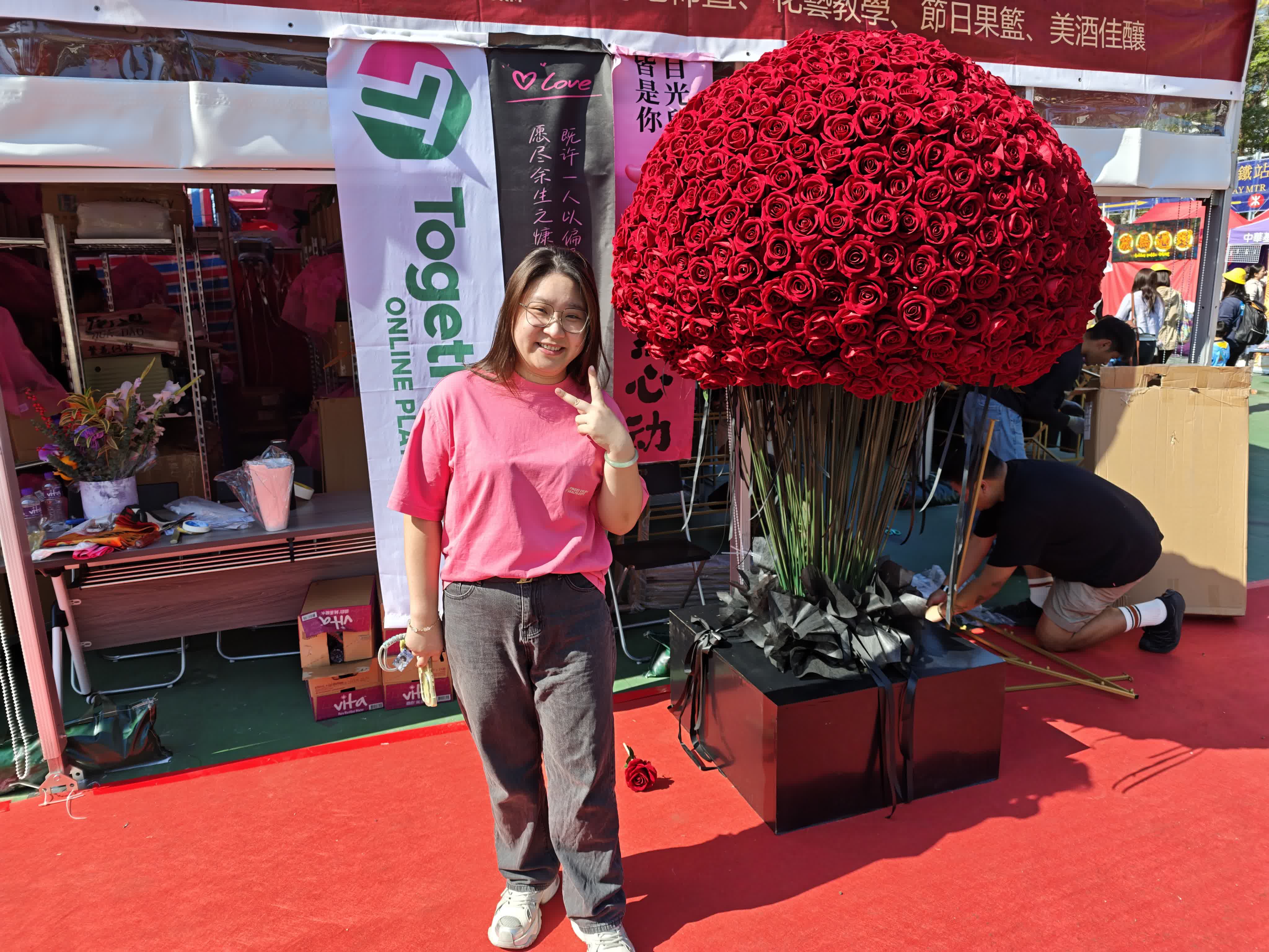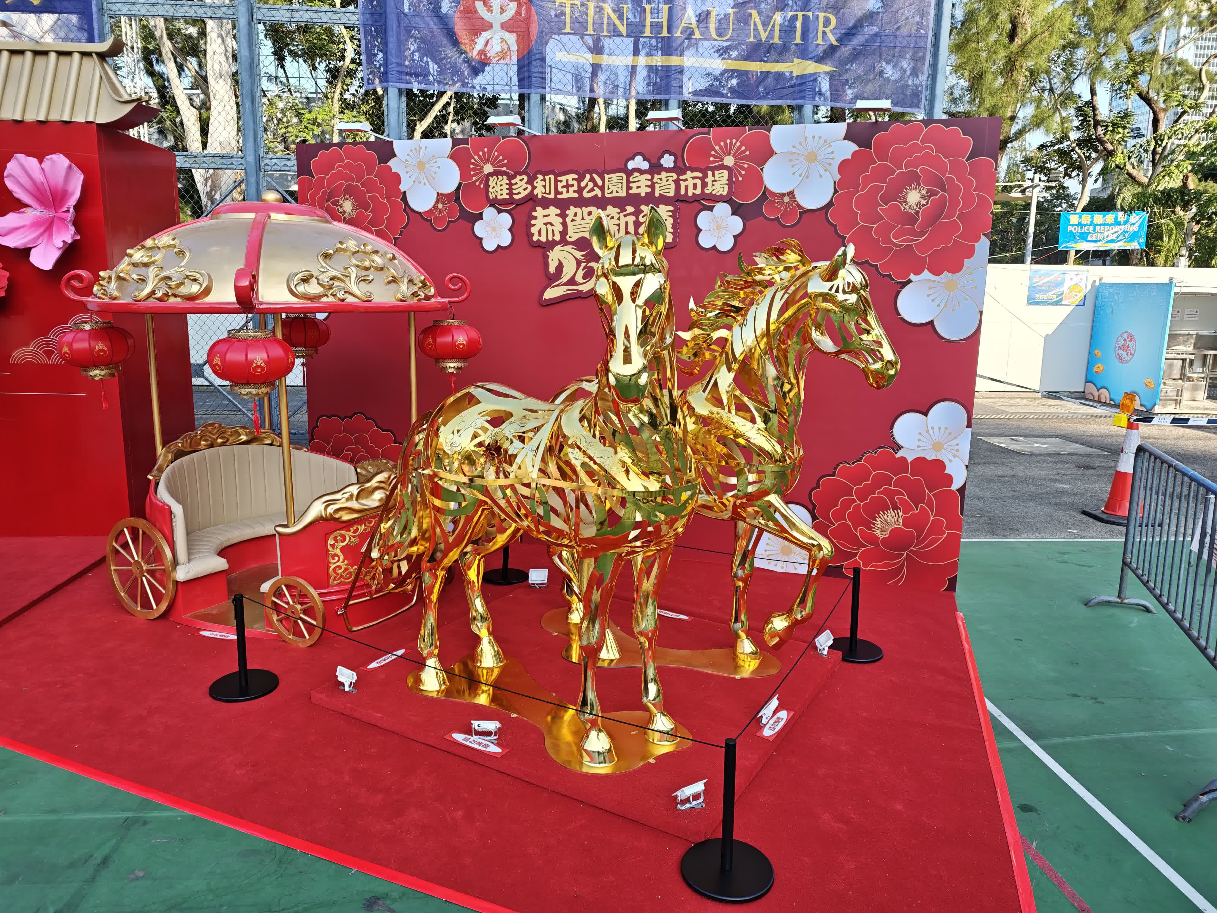 在眾多鮮花攤位中,一個以玫瑰花製作的巨型裝置格外搶眼,不少市民紛紛與其合影留念。裝置製作者、花藝師霍小姐介紹,情人節即將到來,此是她耗時近5日,選用1314枝玫瑰製作而成;此外,配合馬年新春主題,她亦使用人造絹花等組成馬樣式裝飾,「希望大家開開心心,情人終成眷屬。」