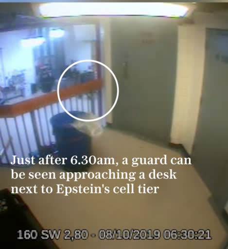 《每日電訊報》稱,該媒體發現的這段視頻清楚顯示,6時30分左右,監控錄影中可見一名獄警走向愛潑斯坦牢房所在隔離樓層旁的值守台。約10秒後,該獄警走向了愛潑斯坦屍體被發現的牢房。一分多鐘後,另一名獄警在上述這張桌子和愛潑斯坦牢房所在層之間來回走動,隨後又有兩名獄警加入。畫面顯示多名獄警在往返穿梭。
