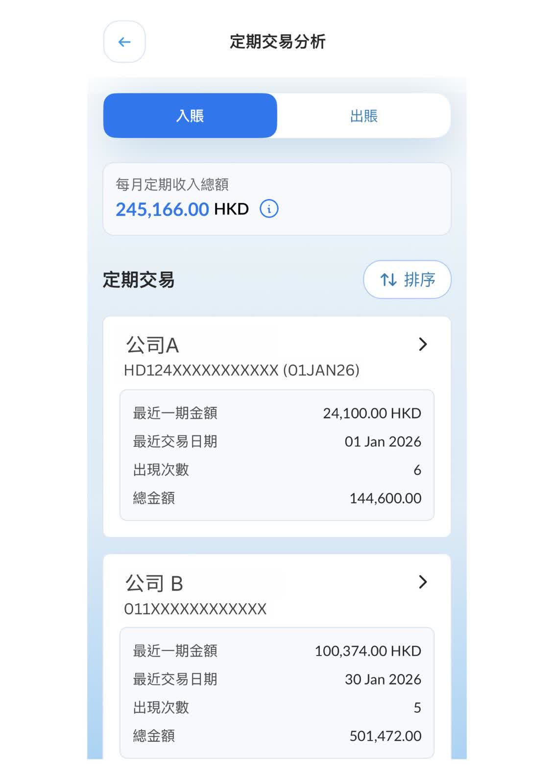 7. 定期交易:檢測跨行賬戶的每月定期收支,預測現金流情況;